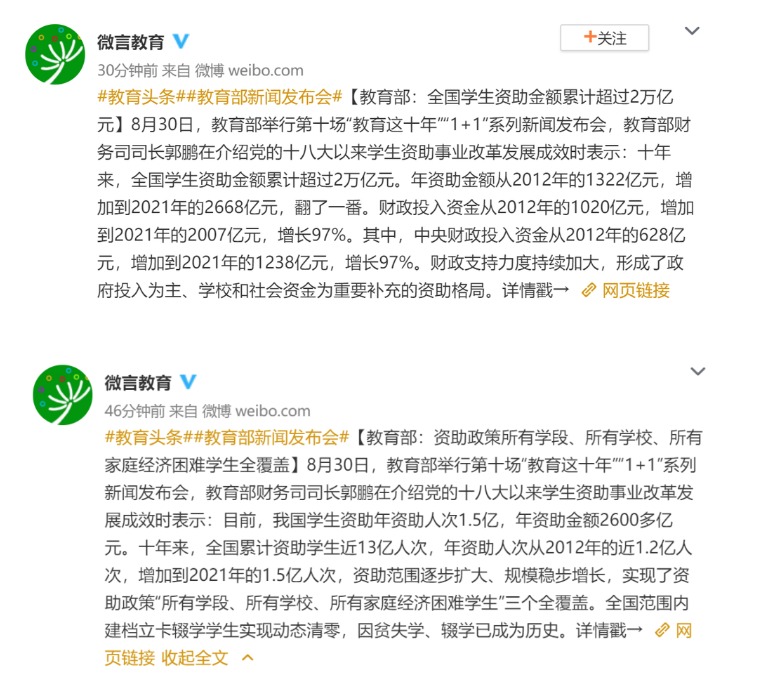 8月30日,教育部举行第十场“教育这十年”“1+1”系列新闻发布会,教育部财务司司长郭鹏在介绍党的十八大以来学生资助事业改革发展成效时表示:十年来,全国学生资助金额累计超过2万亿元。年资助金额从2012年的1322亿元,增加到2021年的2668亿元,翻了一番。财政投入资金从2012年的1020亿元,增加到2021年的2007亿元,增长97%。其中,中央财政投入资金从2012年的628亿元,增加到2021年的1238亿元,增长97%。财政支持力度持续加大,形成了政府投入为主、学校和社会资金为重要补充的资助格局。目前,我国学生资助年资助人次1.5亿,年资助金额2600多亿元。十年来,全国累计资助学生近13亿人次,年资助人次从2012年的近1.2亿人次,增加到2021年的1.5亿人次,资助范围逐步扩大、规模稳步增长,实现了资助政策“所有学段、所有学校、所有家庭经济困难学生”三个全覆盖。全国范围内建档立卡辍学学生实现动态清零,因贫失学、辍学已成为历史。