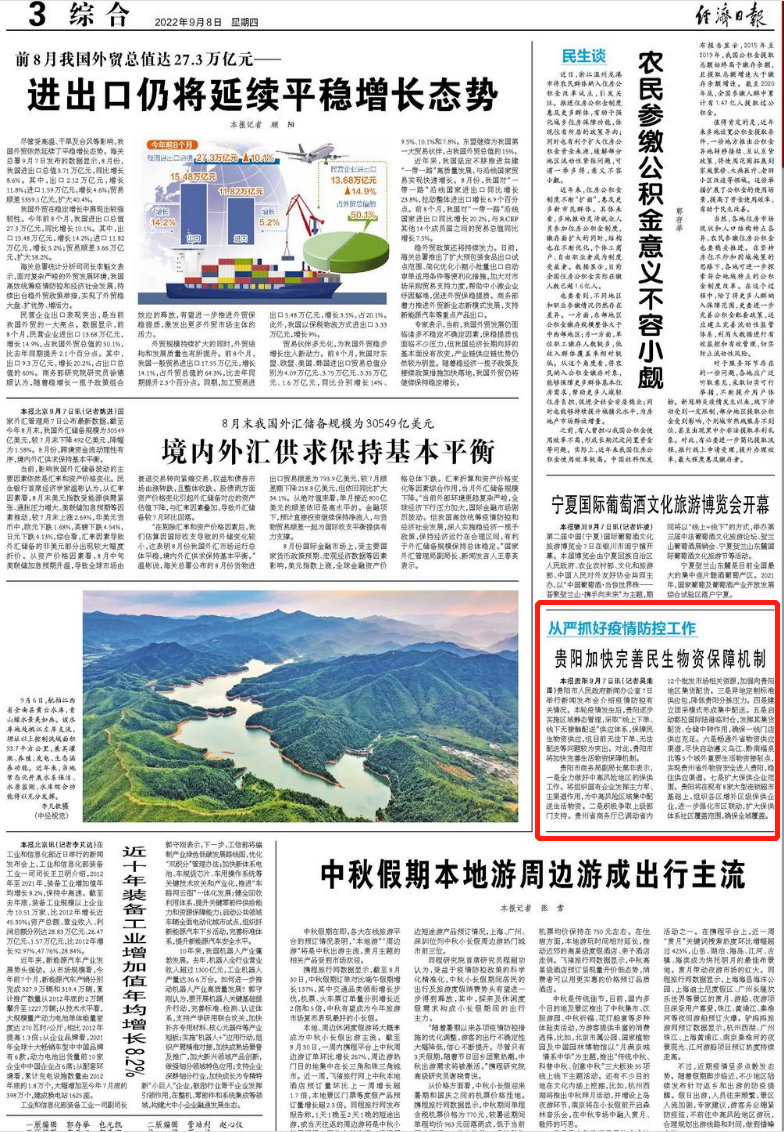 今天(9月8日),《经济日报》刊发新闻《贵阳加快完善民生物资保障机制》。