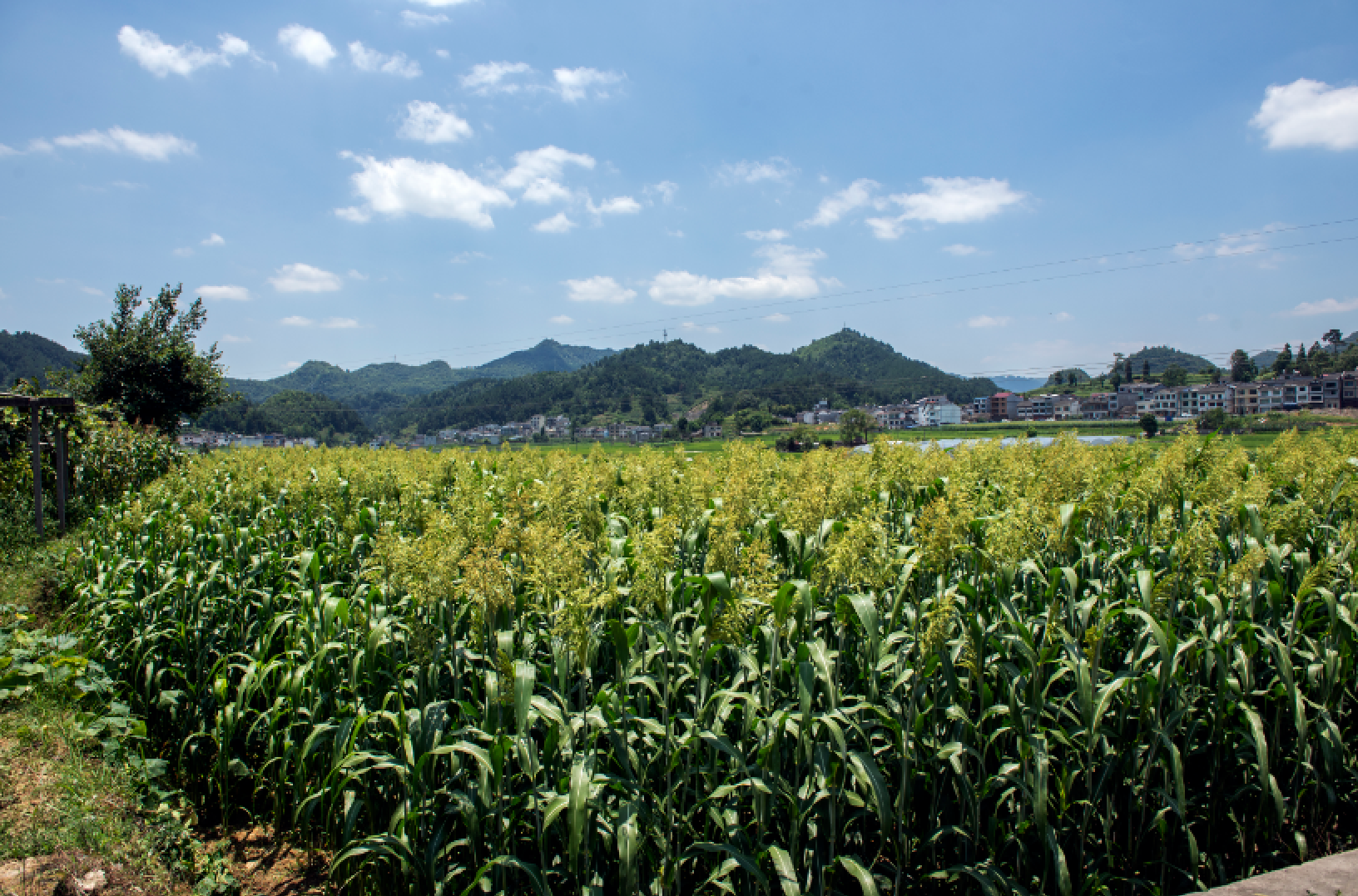 在青河社区,连片种植的580亩高粱青葱茁壮,在骄阳的照耀下散发出阵阵幽香,一条小河顺着高粱地边蜿蜒东流。何康说,这里的土质肥沃,灌溉水源充足,在下个年度,也将把这里有条件“旱改田”的土地改为水田。他说,种植水稻,给人的印象是似乎要富裕一些、有灵气一些;而种植高粱,给人的感觉是要贫瘠一些、“像老高山”一些。
