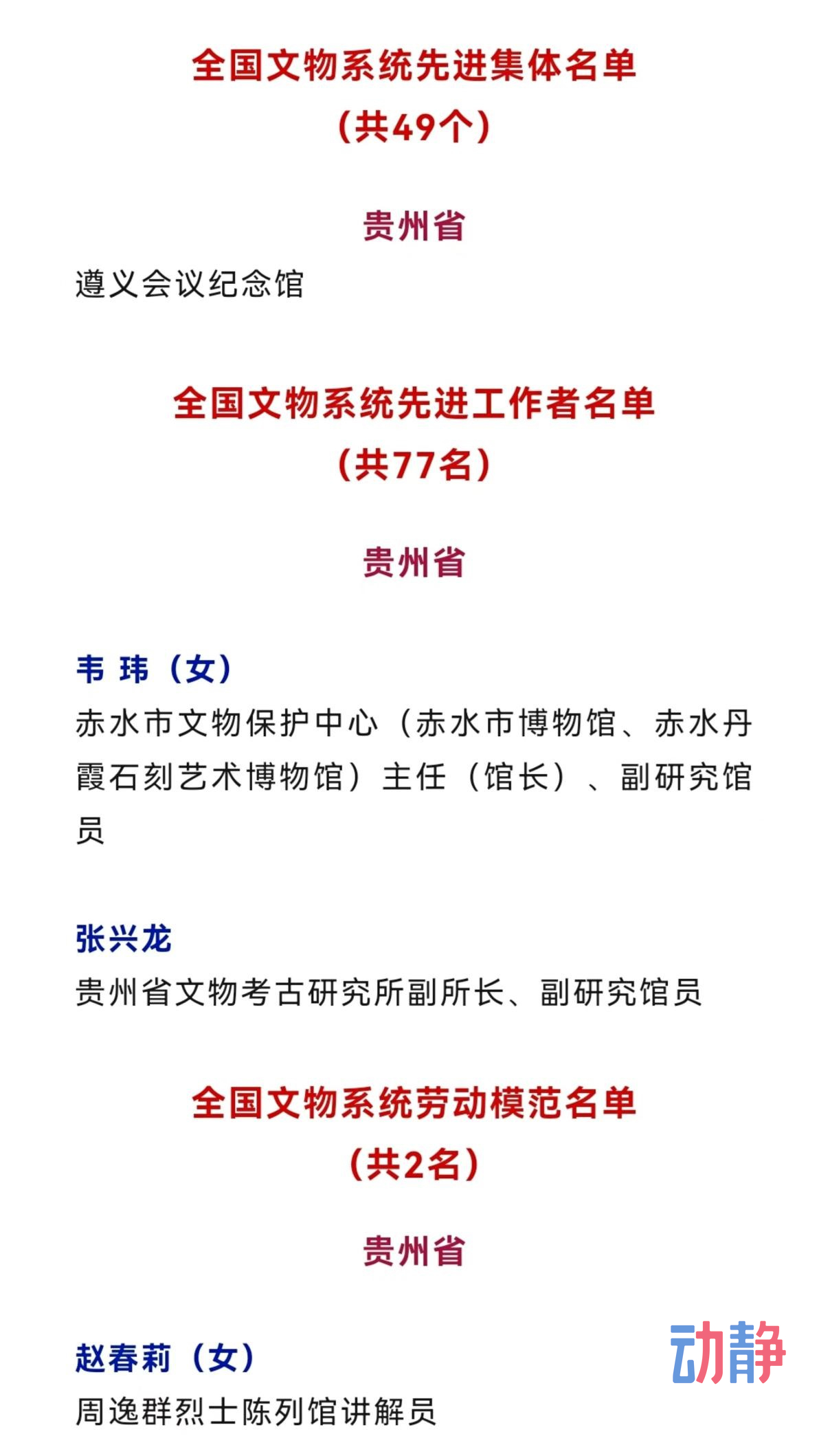 其中,遵义会议纪念馆荣获“全国文物系统先进集体”称号,赤水市文物保护中心主任韦玮、贵州省文物考古研究所副所长张兴龙荣获“全国文物系统先进工作者”称号,贵州省周逸群烈士陈列馆讲解员赵春莉荣获“全国文物系统劳动模范”称号,受表彰个人享受省部级表彰奖励获得者待遇。