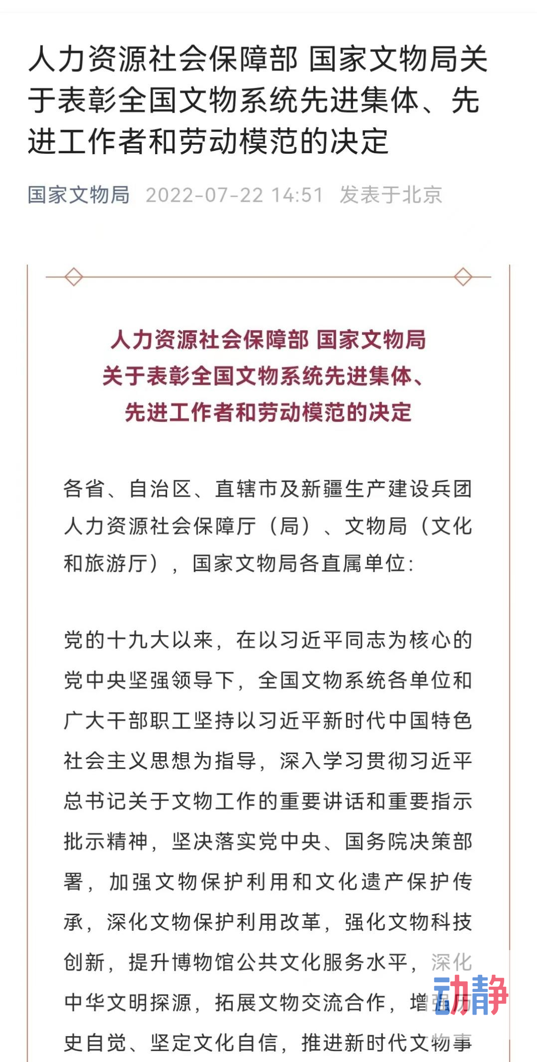今天,国家文物局微信公众号发布了《人力资源社会保障部 国家文物局关于表彰全国文物系统先进集体、先进工作者和劳动模范的决定》,正式公布全国文物系统先进集体(49个)、先进工作者(77名)和劳动模范(2名)名单。