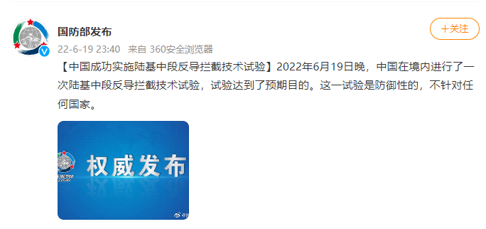 2022年6月19日晚,中国在境内进行了一次陆基中段反导拦截技术试验,试验达到了预期目的。这一试验是防御性的,不针对任何国家。