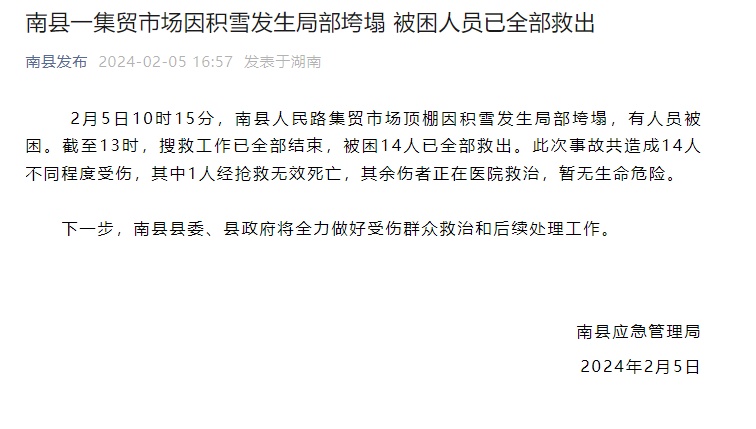 2月5日下午,湖南南县应急管理局通报,2月5日10时15分,南县人民路集贸市场顶棚因积雪发生局部垮塌,有人员被困。截至13时,搜救工作已全部结束,被困14人已全部救出。此次事故共造成14人不同程度受伤,其中1人经抢救无效死亡,其余伤者正在医院救治,暂无生命危险。
