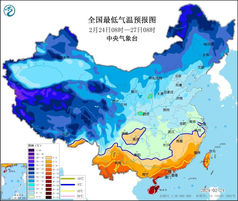 预计,2月24日08时至27日08时,江淮中西部、江汉大部、江南中部和西部、西南地区东部和北部、广西、广东北部以及陕西东南部、甘肃东南部、新疆沿天山地区、西藏南部等地的日平均气温较历史同期偏低5℃以上,其中,湖北中部和南部、湖南大部、江西中部、贵州大部、广西中北部、四川中西部、新疆沿天山地区等地的日平均气温较历史同期偏低7℃以上,最低气温0℃线将位于贵州西南部、广西北部、江西北部至江苏南部一带。