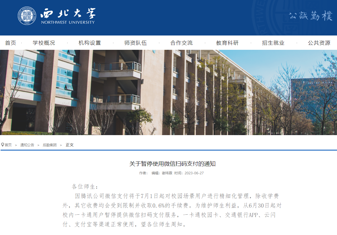 西北大学发布的公告称,“因腾讯公司微信支付将于7月1日起对校园场景用户进行精细化管理,除收学费外,其它收费均会受到限制并收取0.6%的手续费。为维护师生利益,从6月30日起对校内一卡通用户暂停提供微信扫码支付服务,一卡通校园卡、交通银行App、云闪付、支付宝等渠道正常使用,望各位师生周知。”
