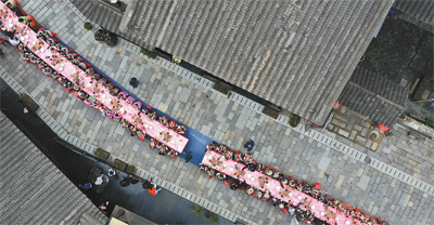 3月25日,游客在贵州省丹寨县万达小镇,品尝“春宴”。