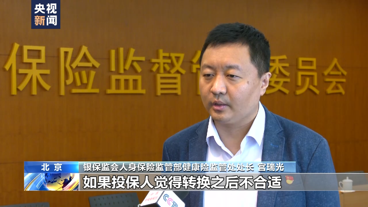 银保监会人身保险监管部健康险监管处处长 宫瑞光:为了保护投保人的利益,我们这一次在转换业务过程中也设置了一个犹豫期,一般10天或者15天,如果投保人觉得转换之后不合适,也可以在犹豫期内及时向保险公司进行申请,这样把保单又重新恢复到原有的寿险保单的原样。