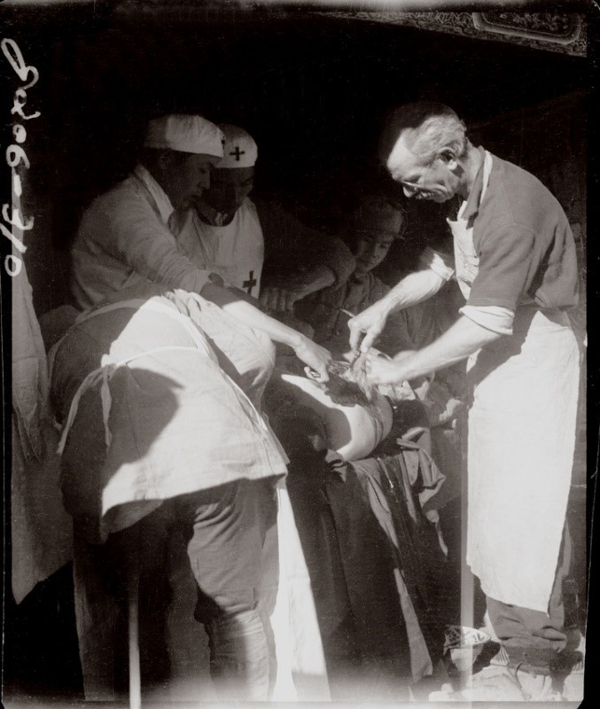 10月,日军对晋察冀边区发动大规模冬季大“扫荡”。罗光达跟随八路军采访,行进至孙家庄小庙时,他看到来自加拿大的医生白求恩正在带领医疗团队对伤员展开紧急抢救。在用门板搭起的手术台上,白求恩神情严肃,紧握手术刀在给伤员认真做手术,这一幕激发了罗光达的拍摄冲动。后来罗光达回忆:我见到这生动的场面,立即选择最佳拍摄点。这一天天气格外晴朗,我不失时机地抓拍了白求恩和整个医疗队活动的各个瞬间,重点拍摄了白求恩在手术台前紧张地抢救伤病员为他们做手术的镜头。手术涉及的人物不止白求恩一个,但由于罗光达对拍摄角度、相机参数等的选择,使其他人的形象都“隐藏”在了屋顶的阴影中,各人物形象的详略通过光的调度显得层次分明,白求恩的典型形象得以凸显。