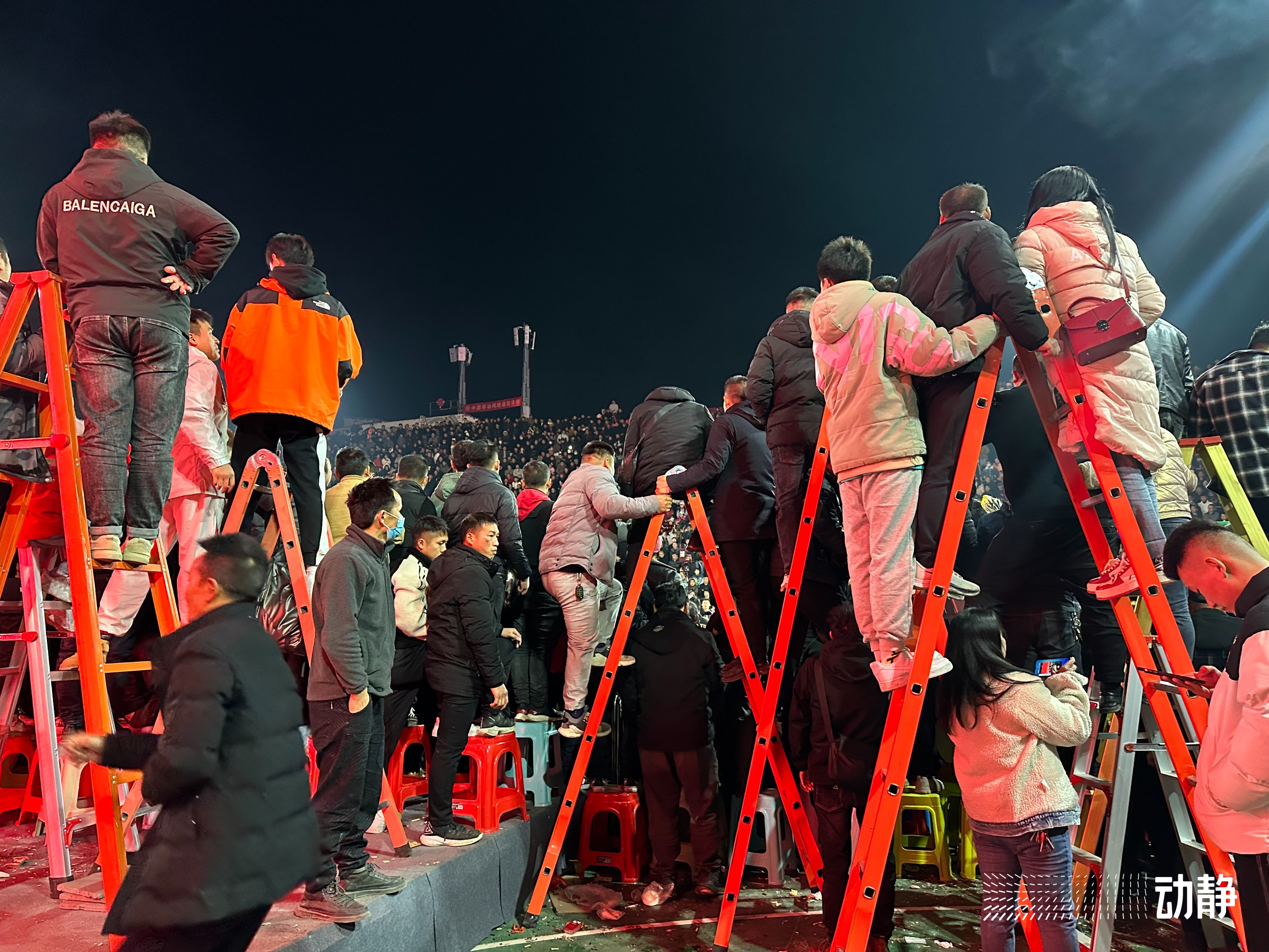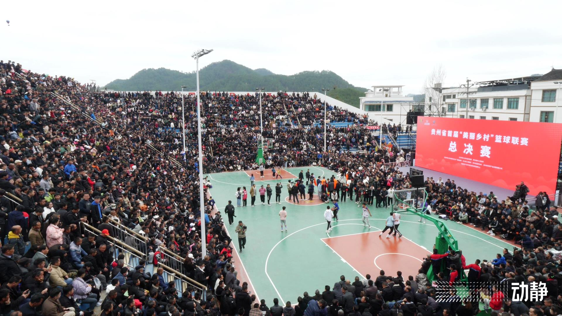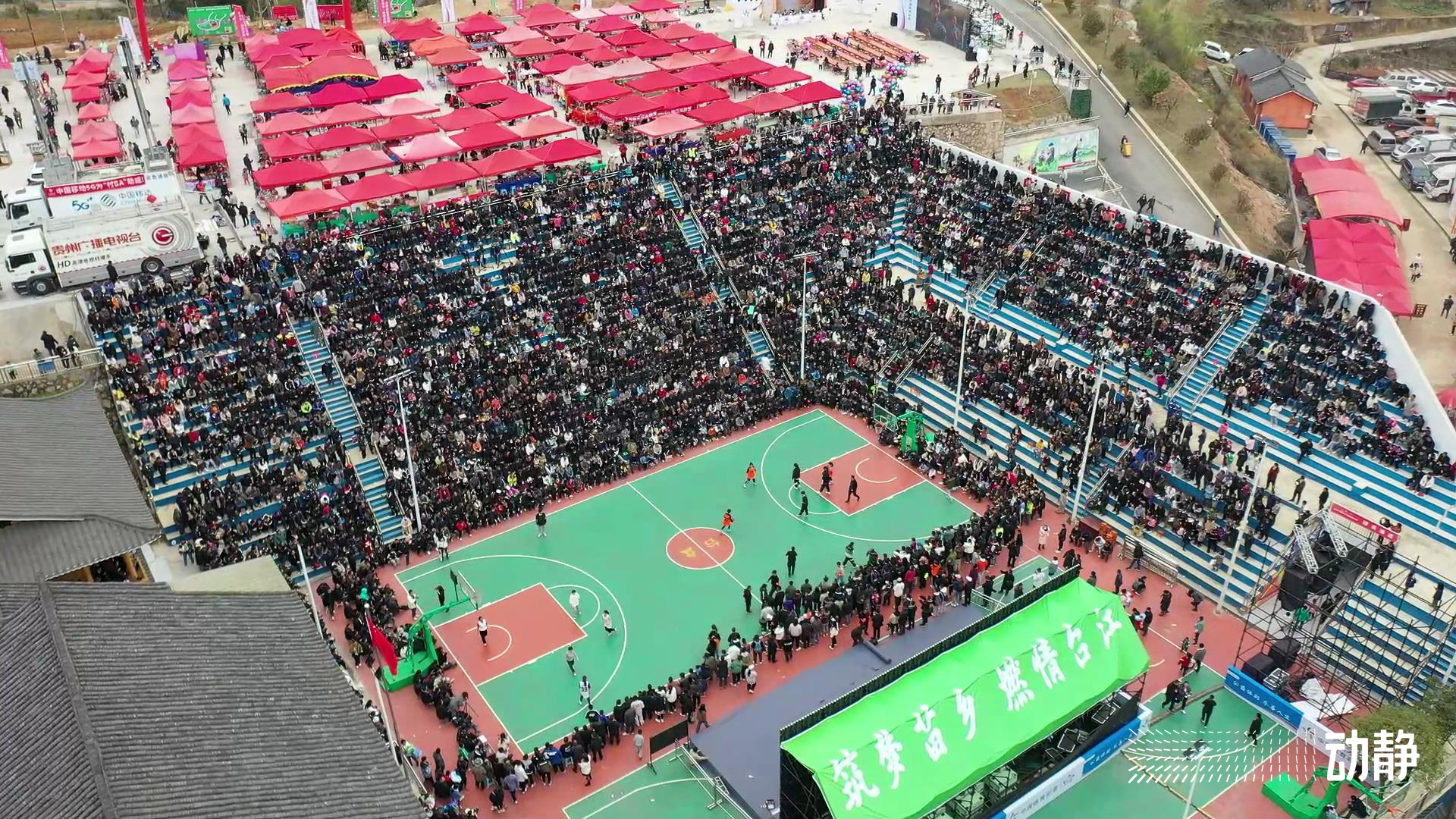 如今,“村BA”的赛场上,观众已经不只是周边的村民,远在贵阳铜仁等地的群众,也乘坐高铁、或开几个小时的车来到现场。来得早的,坐进了球场周围50级台阶上的座位,来得晚的也想方设法站上了三米高的楼梯,就连篮筐下的基座上也“挂”满了群众。