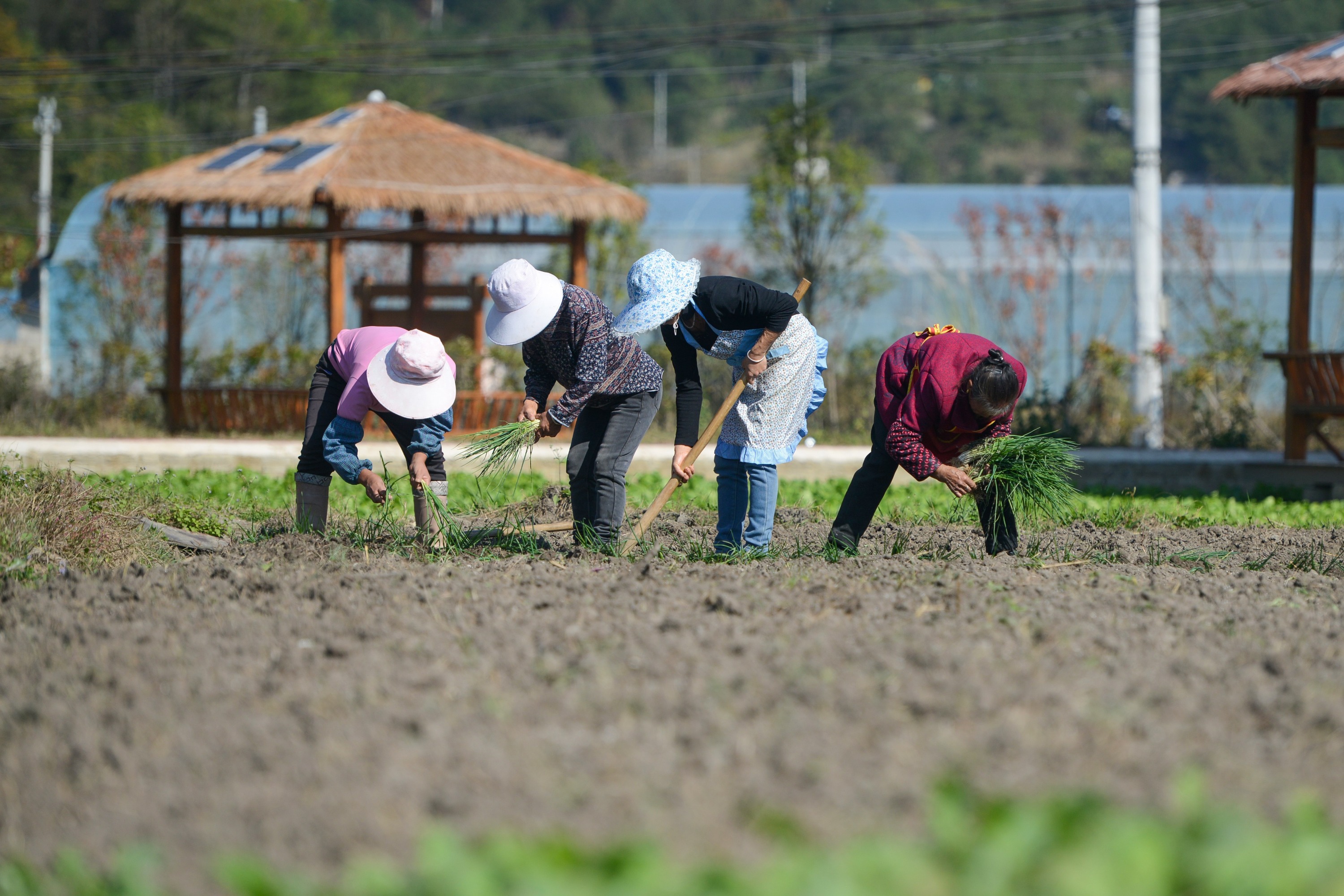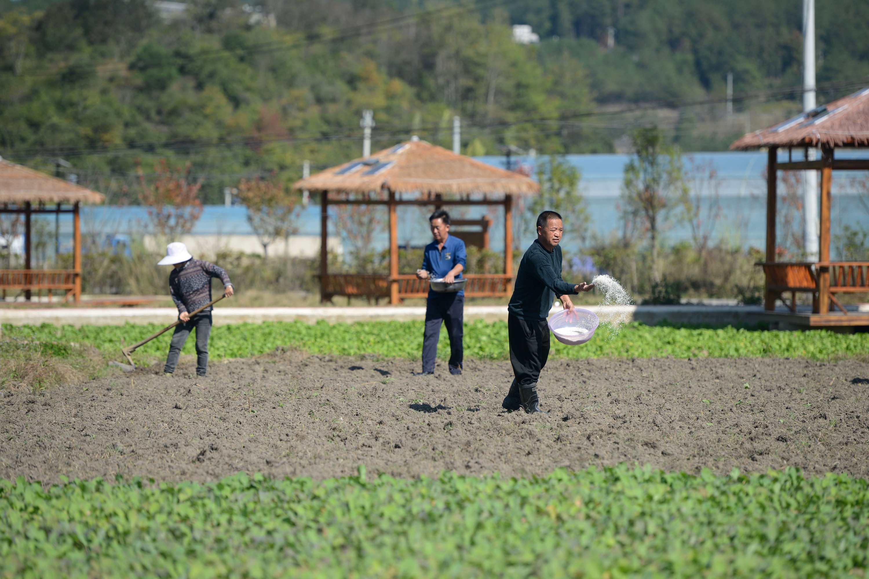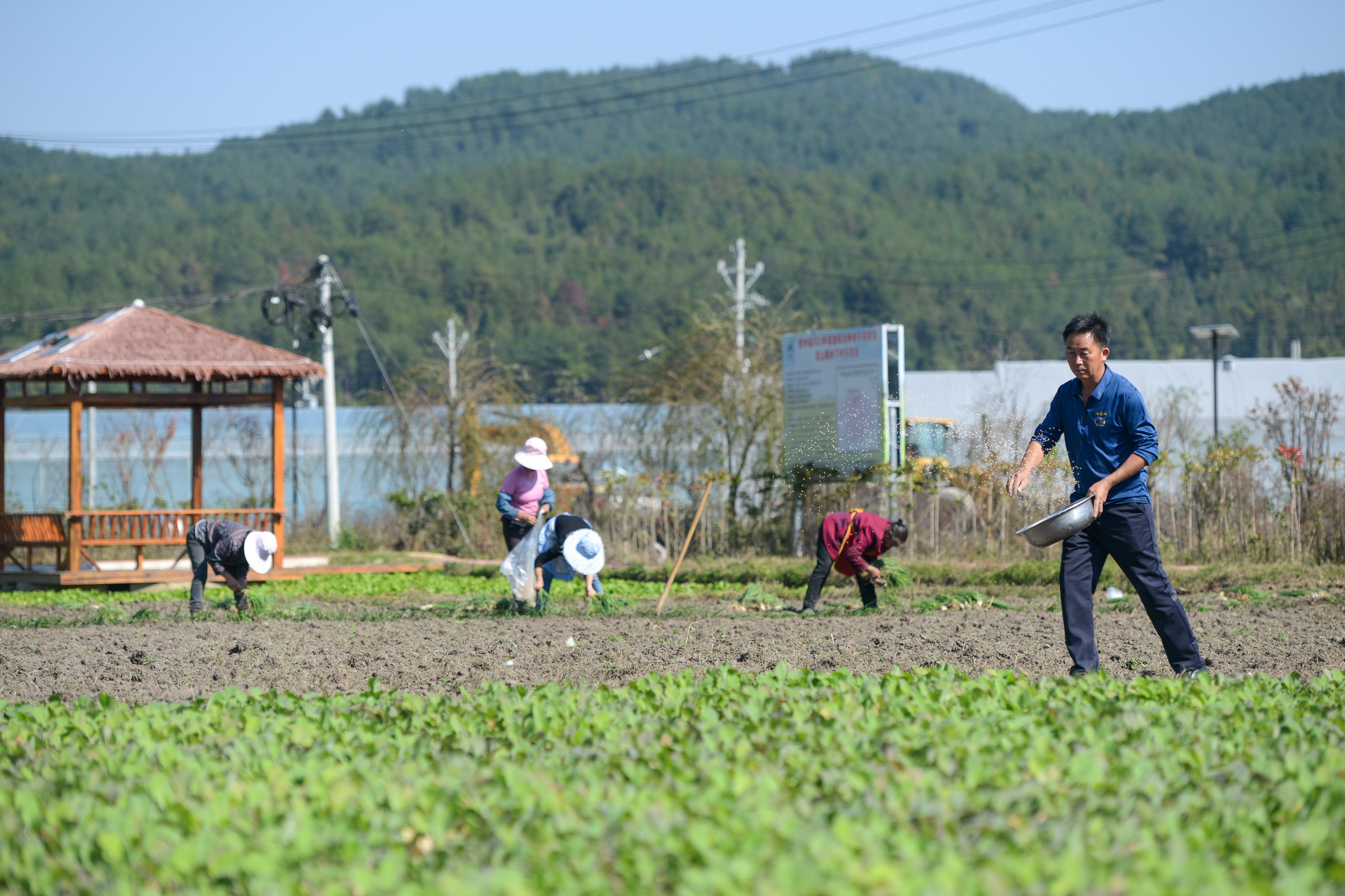 中午时分,余下村驻村干部胡继贵在路边扒过几口饭,就跑到田埂上把葱苗往车上一装,拉到另一头的蔬菜种植基地里。此时,香葱基地已经来了10多名工人,撒肥、掏坑、放苗、盖土……一派繁忙景象。