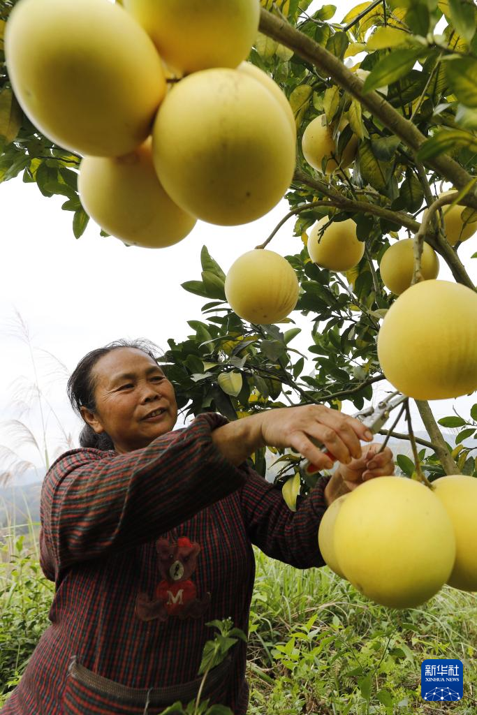 10月26日,村民在贵州省开阳县花梨镇清江村蜜柚种植基地里采摘柚子。