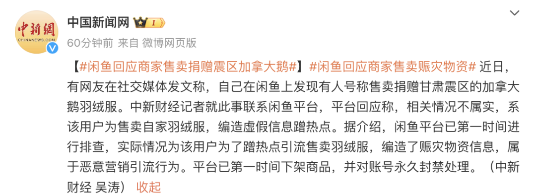 近日,有网友在社交媒体发文称,自己在二手交易平台上发现,有人号称售卖捐赠甘肃震区的加拿大鹅羽绒服。