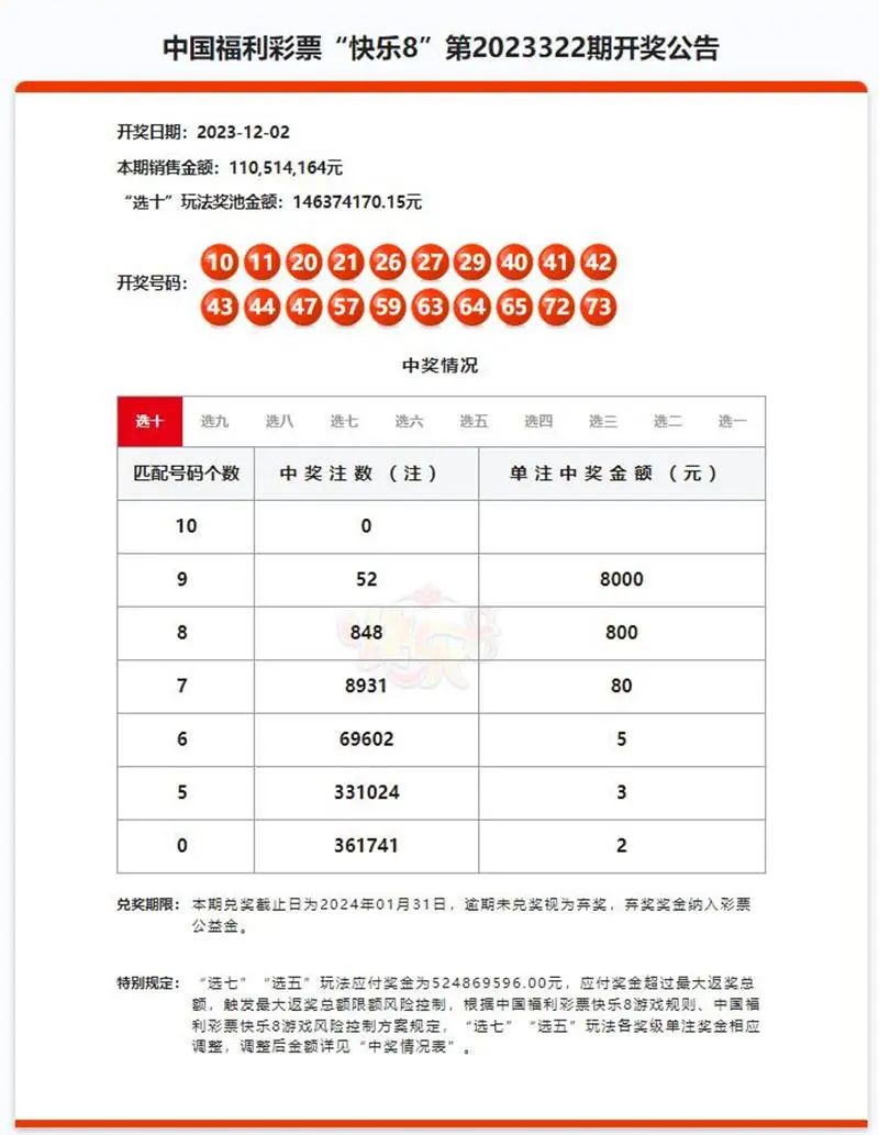 12月2日,江西南昌一彩民在福彩站点,共购买了近50000注号码相同的快乐8游戏“选七”玩法的彩票。当晚,他所购彩票均中得快乐8“选七中七”奖项,总奖金达2亿多元。据《江西日报》报道,12月5日,中奖彩民来到江西省福彩中心兑奖,并表示:“我就是那个快乐8大奖得主”。