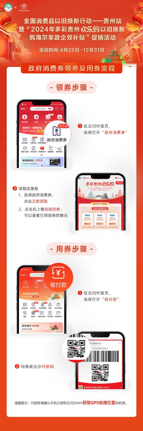 记者从4月26日启动的全国消费品以旧换新行动——贵州站暨“2024年多彩贵州欢乐购以旧换新 购海尔享政企双补贴”促销活动上获悉,在五一劳动节、6·18大促、国庆节等法定假日和购物节节点,消费者在指定的省内家电家居零售企业购买家电家居产品,可享受满1000元减100元、满5000元减500元、满10000元减1000元等不同力度的满减,享受实实在在的优惠。首轮消费券将于4月26日至5月5日每日上午10:30发放,先到先得,领完即止,使用日期截止至5月31日。
