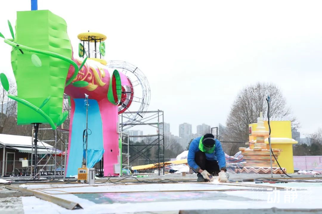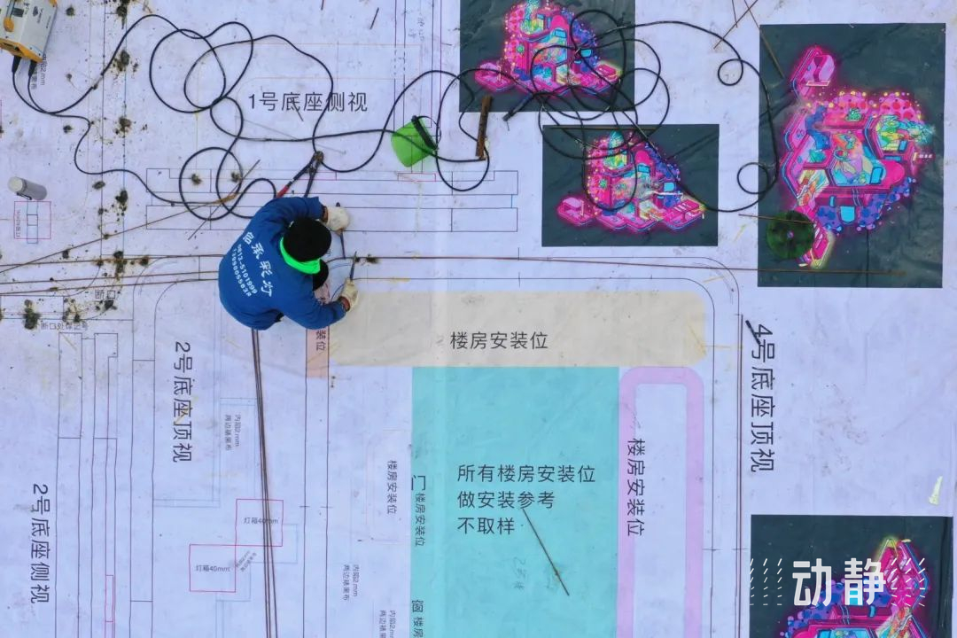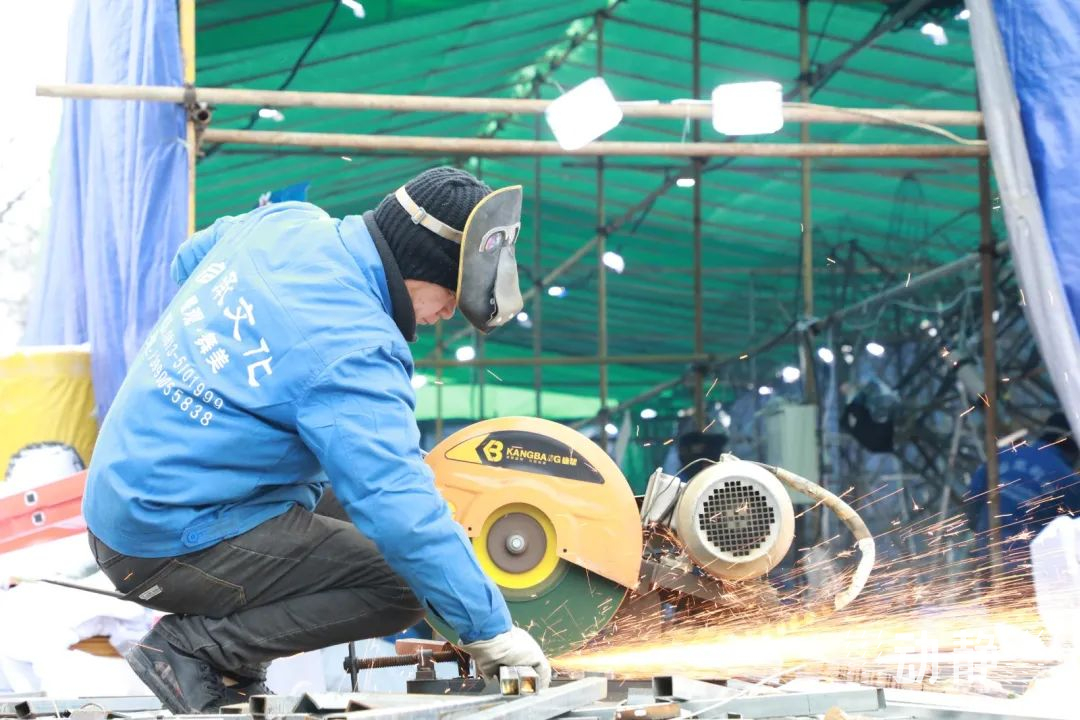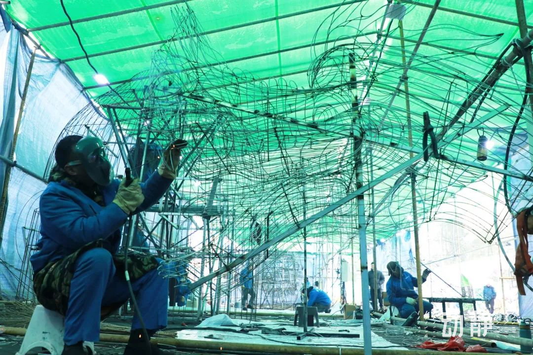 目前,灯会庙市正在紧张施工中,在现场,近百名工人师傅正在对灯组做焊接固定,部分灯组已初见雏形。