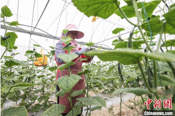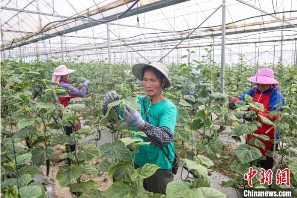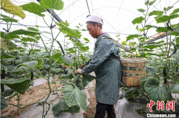 10月10日,贵州省黔南布依族苗族自治州龙里县湾滩河镇,农户在黄瓜种植基地采摘黄瓜。中新社记者 瞿宏伦 摄