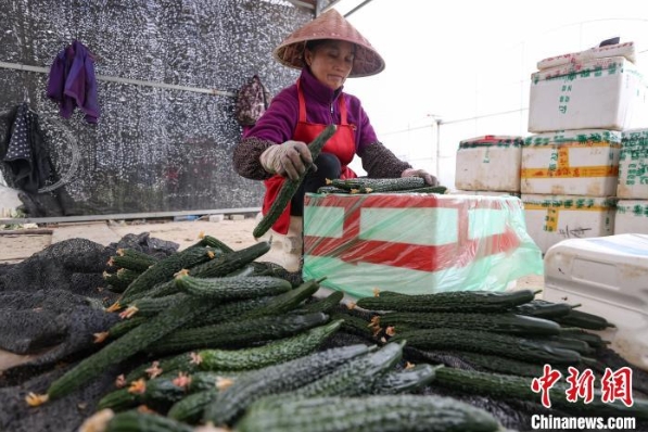 10月10日,贵州省黔南布依族苗族自治州龙里县湾滩河镇,农户在黄瓜种植基地将采摘的黄瓜装箱。中新社记者 瞿宏伦 摄