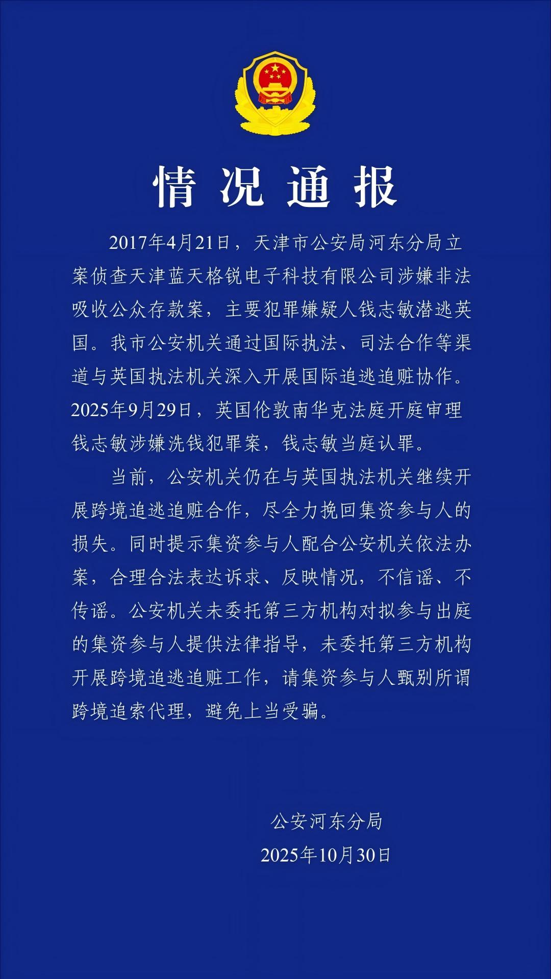 2017年4月21日,天津市公安局河东分局立案侦查天津蓝天格锐电子科技有限公司涉嫌非法吸收公众存款案,主要犯罪嫌疑人钱志敏潜逃英国。天津市公安机关通过国际执法、司法合作等渠道与英国执法机关深入开展国际追逃追赃协作。