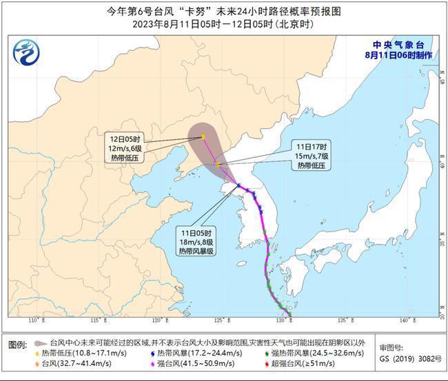 今年第6号台风“卡努”(KHANUN)(热带风暴级)的中心今天(8月11日)早晨5点钟位于朝鲜南部,就是北纬38.5度、东经126.3度,外围最大风力有8级(18米/秒),中心最低气压为994百帕。