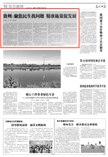 9月7日,《光明日报》综合新闻版面头条刊发《贵州:聚焦民生找问题 精准施策促发展》。报道说,主题教育期间,贵州解决了一大批困扰基层的痼疾。贵州以“黔进先锋·贵在行动”为总载体,构建党组织领导下的自治、法治、德治相结合的基层治理体系,全面提升了基层治理现代化水平。