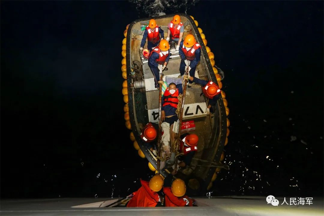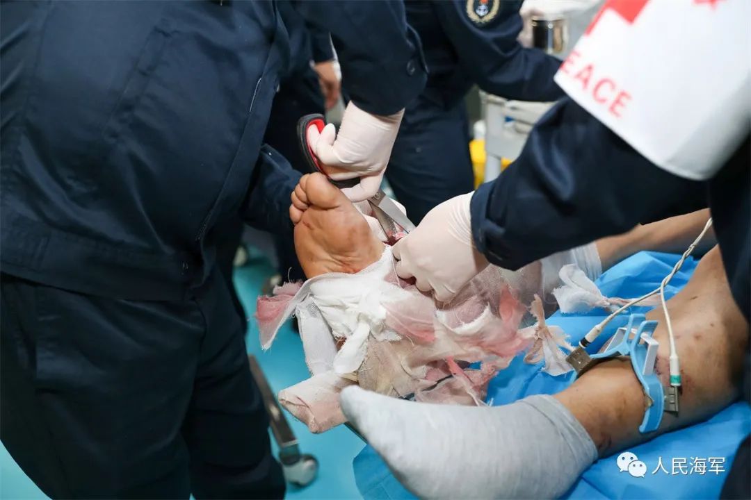 5分钟后,渔船靠近医院船,两名身系安全带的安全员通过小艇和软梯将尚某转运至船上。林文波立即上前,手握患者脚部感受温度,足背动脉搏动平稳,说明肢体血供正常,他不禁心里一松。