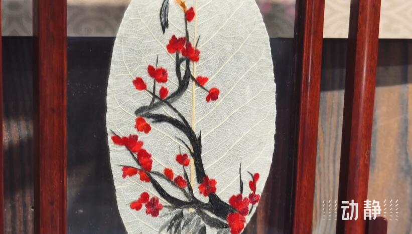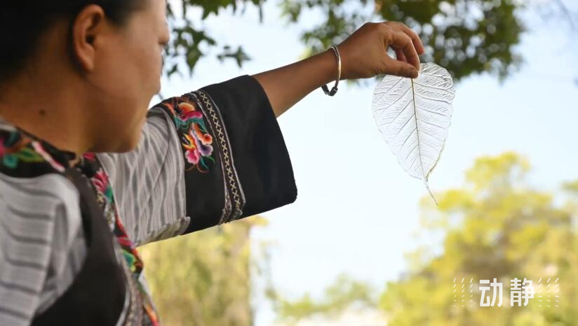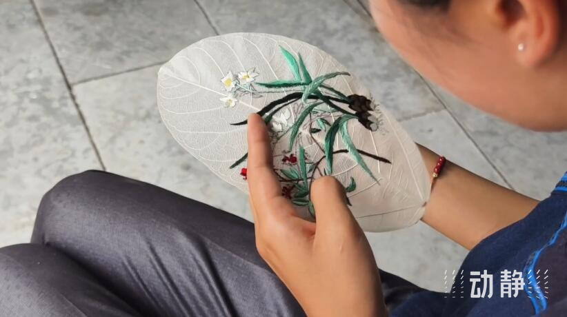 杨丽是贵州苗绣非遗传承人、叶脉绣创始人,其创作的叶脉绣是“黔绣”系列核心刺绣艺术品之一,以树叶为载体,将灵动的传统刺绣图案与树叶千奇百怪的天然纹理完美结合,既有传统刺绣美学韵味,又富有时代工艺特色。一直以来,杨丽都致力于叶脉绣的传承与发展当中,通过打造非遗传承人IP账号“村花姐(黔绣杨丽)”开展直播助农活动,让非遗适应当下,为传统文化的保护与发展注入活力。