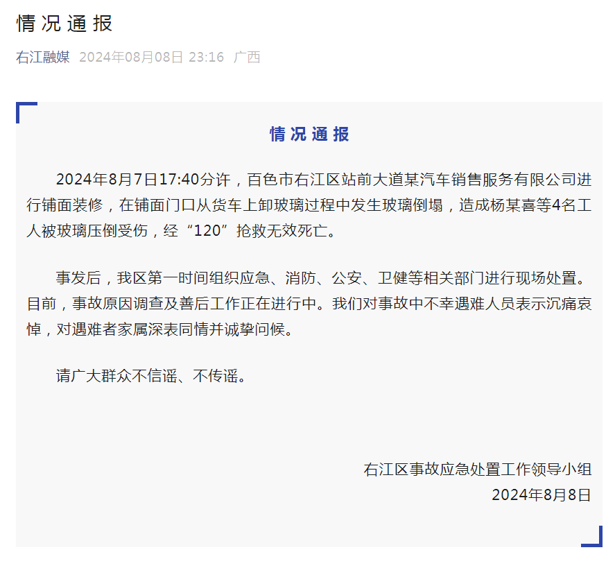 8日深夜,“右江融媒”公众号发布情况通报:2024年8月7日17:40分许,广西百色市右江区站前大道某汽车销售服务有限公司进行铺面装修,在铺面门口从货车上卸玻璃过程中发生玻璃倒塌,造成杨某喜等4名工人被玻璃压倒受伤,经“120”抢救无效死亡。