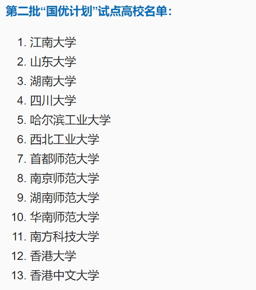 第二批试点支持哈尔滨工业大学、南方科技大学等11所“双一流”建设高校和香港大学、香港中文大学承担“国优计划”研究生培养任务。