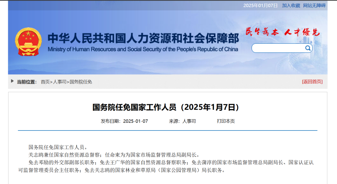 免去关志鸥的国家林业和草原局(国家公园管理局)局长职务。