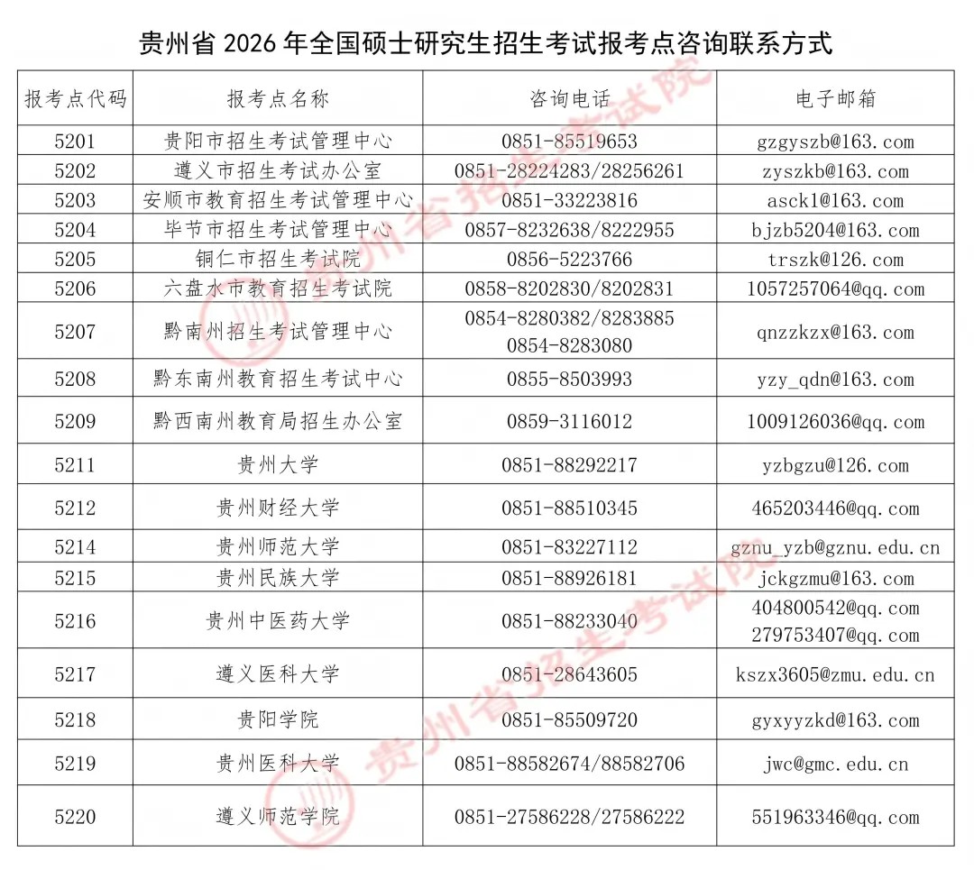 七、贵州省2026年全国硕士研究生招生考试报考点咨询联系方式