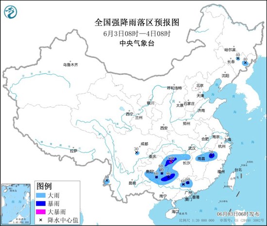 中央气象台6月3日06时继续发布暴雨蓝色预警: