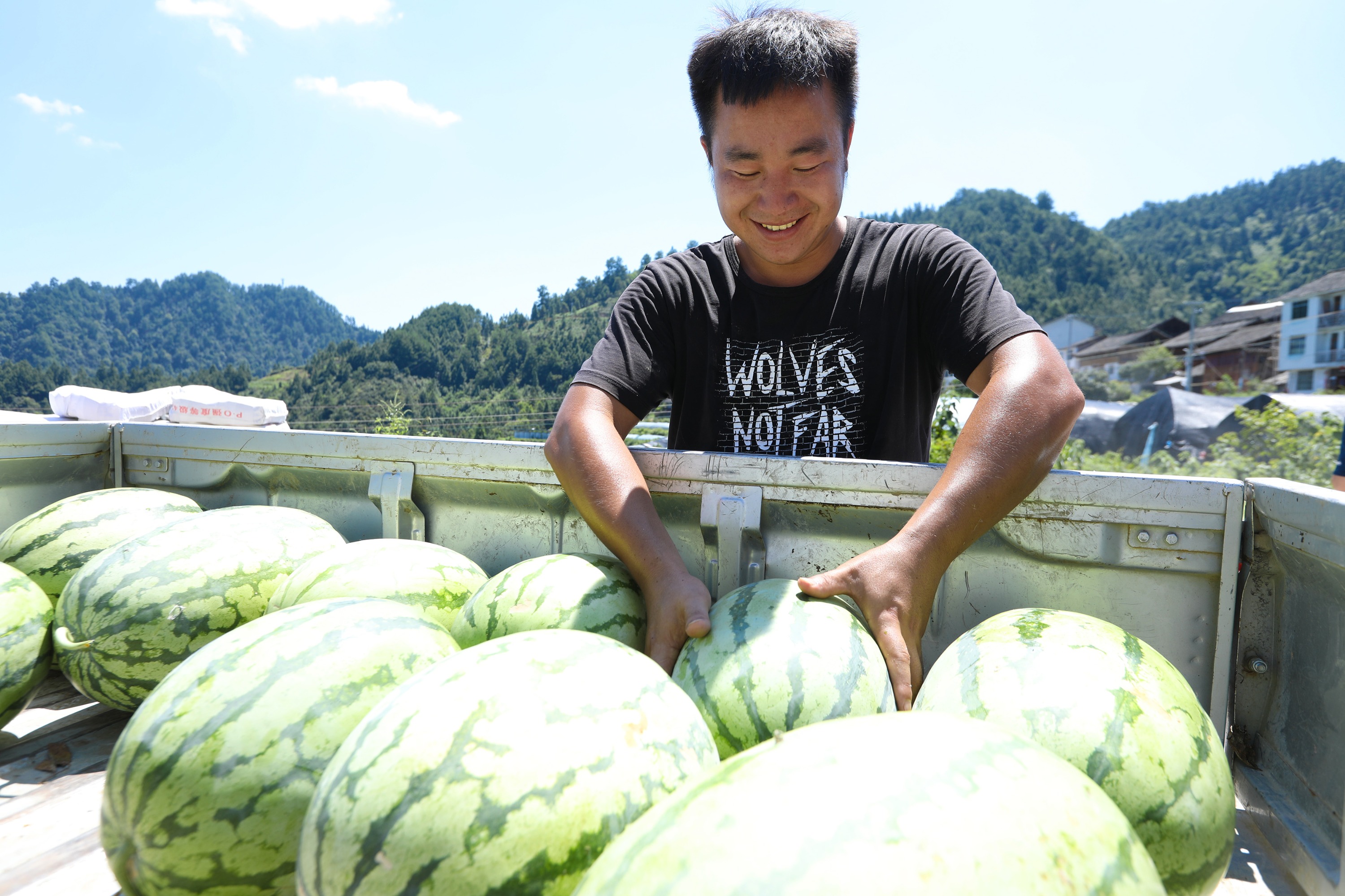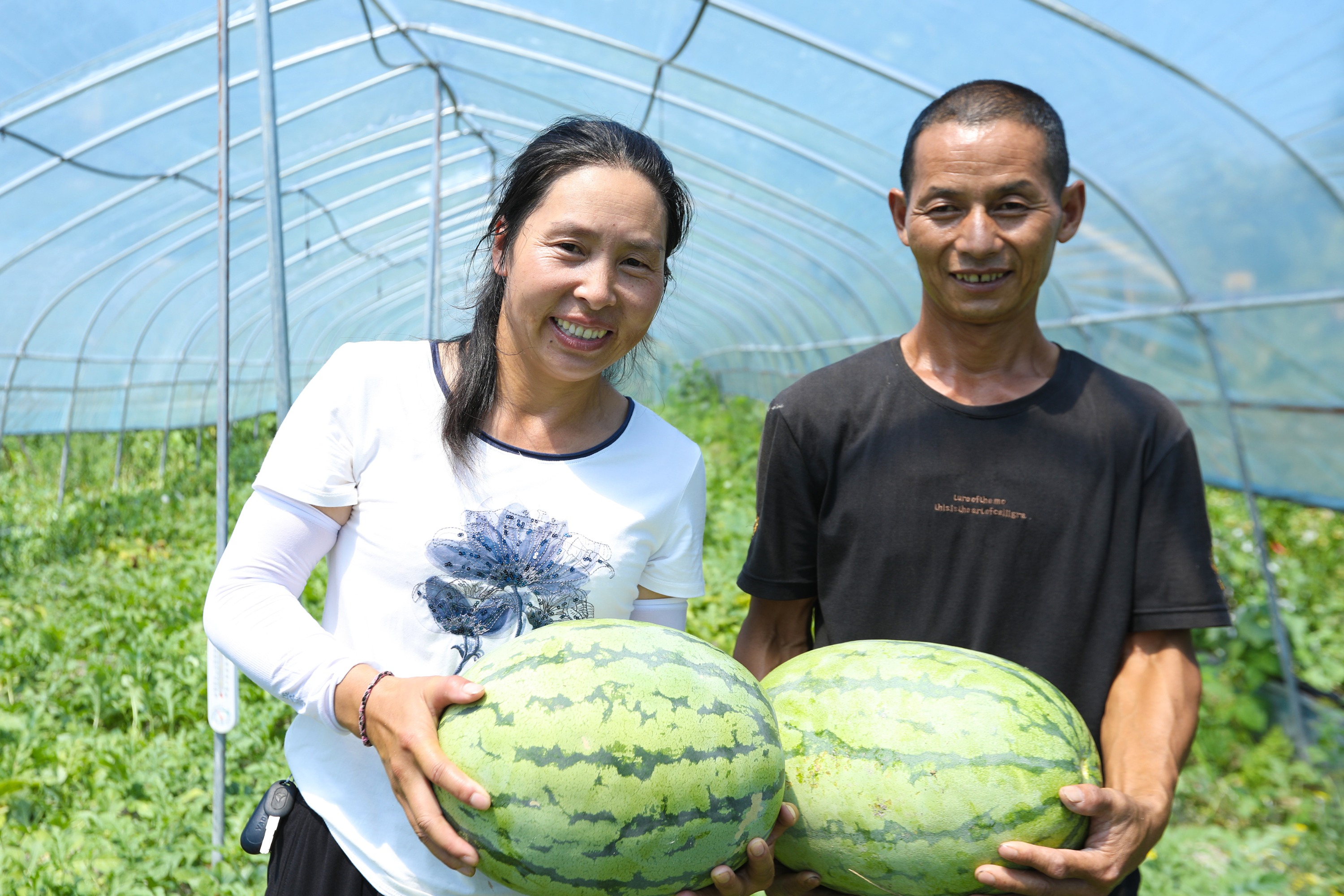 仲夏时节,瓜果飘香。在贵州省剑河县加禾村的羊肚菌种植示范基地的大棚内,一个个浑圆饱满的西瓜“躲”在茂盛的瓜藤下,惹人喜爱。工人们正顶着烈日忙着采摘、装车。