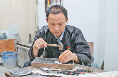 “当当当……”左手用錾子按住银片,右手拿小锤敲击錾子。换了好几种不同型号的錾子后,银片上的图案逐渐清晰起来:戴着帽子的人正策马扬鞭。吴水根拿起银片,在灯光下反复检查后,将银片与其他成品放在一起。