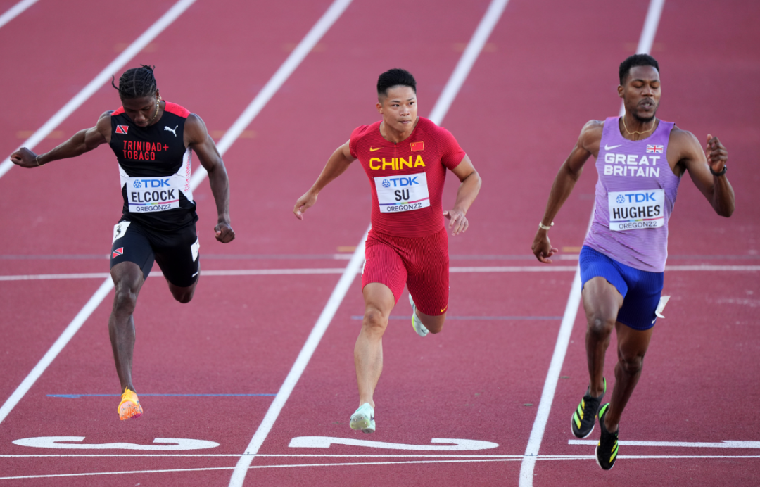 ▲苏炳添(中)在男子100米预赛中获小组第5名。 新华社记者 王迎 摄