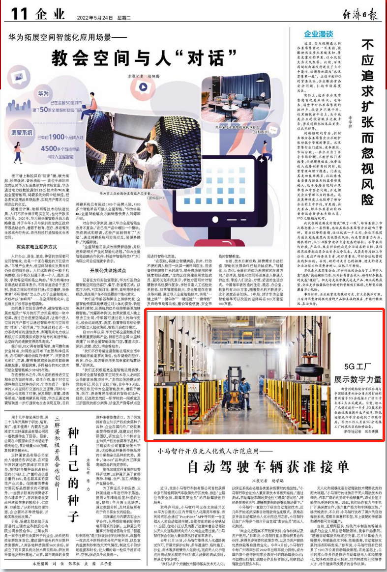 今天(5月24日),《经济日报》刊发新闻《5G工厂 展示数字力量》。