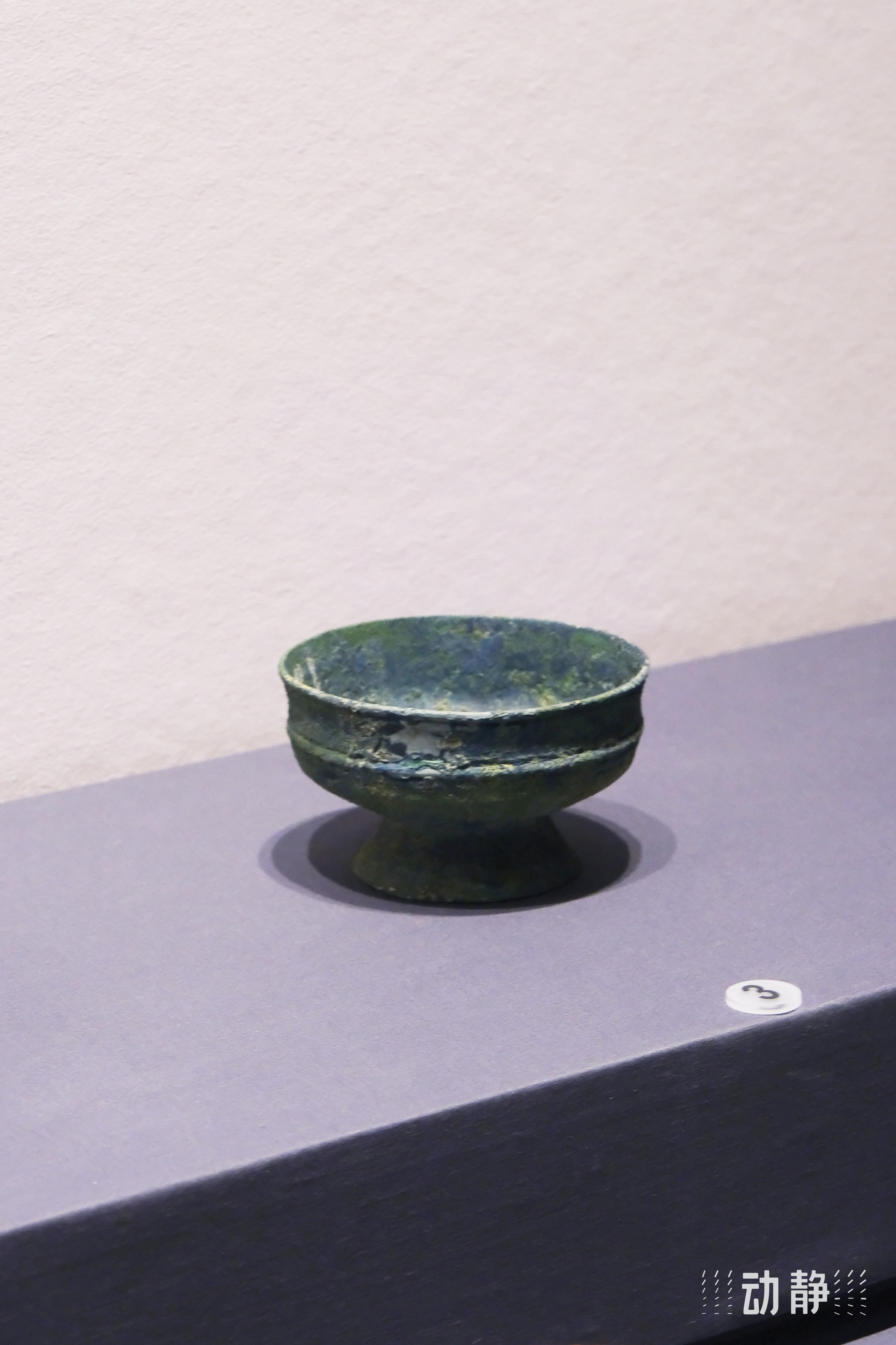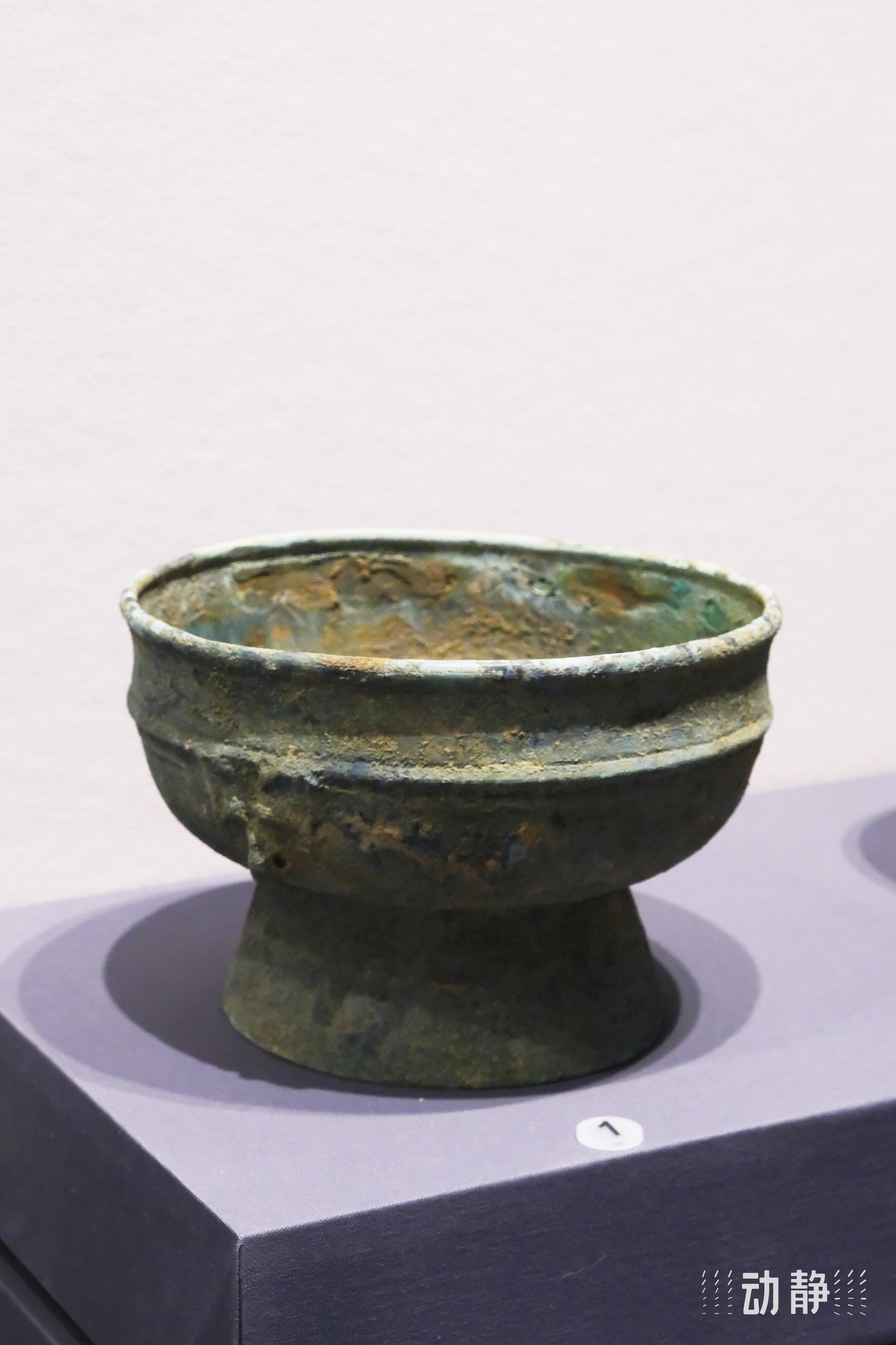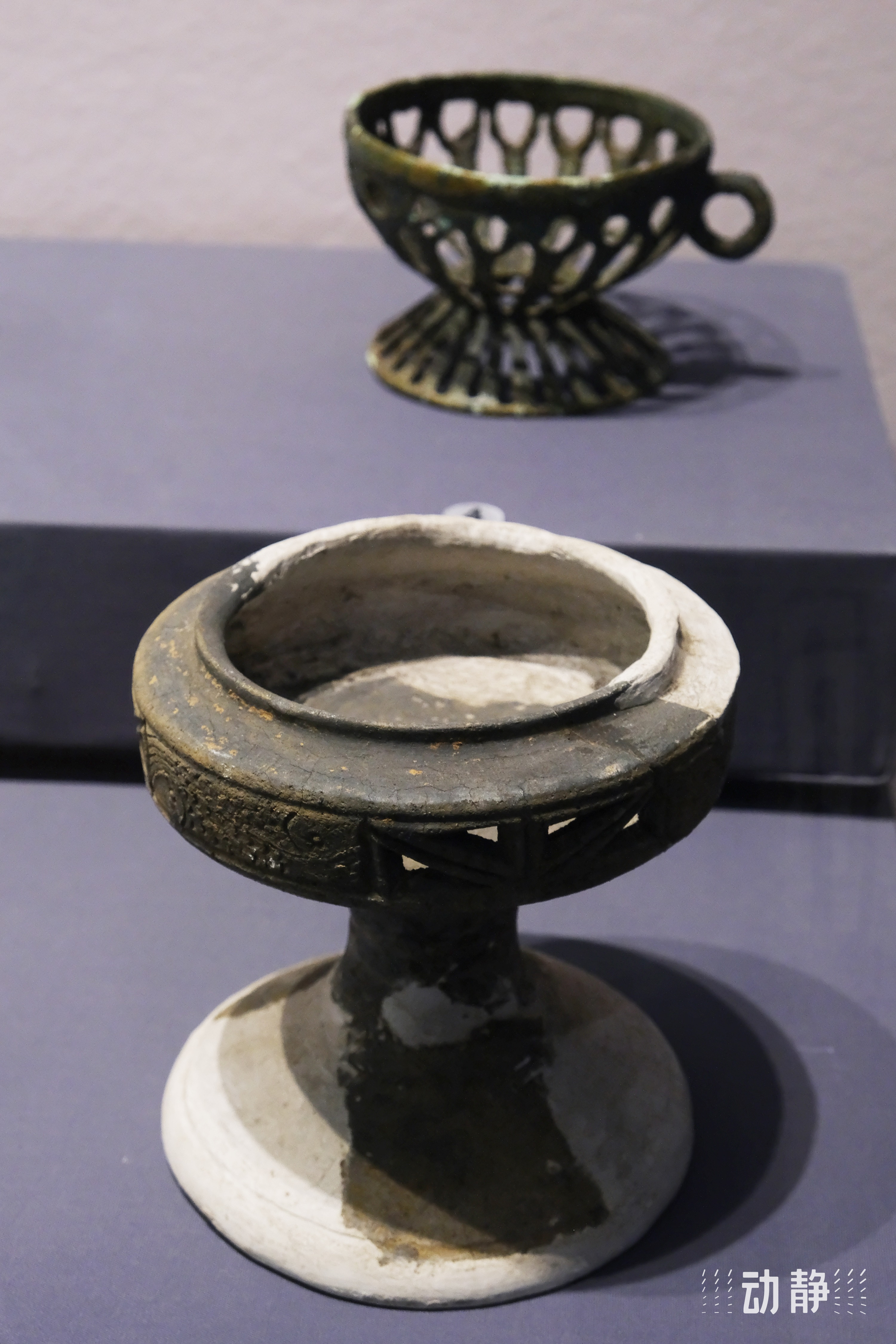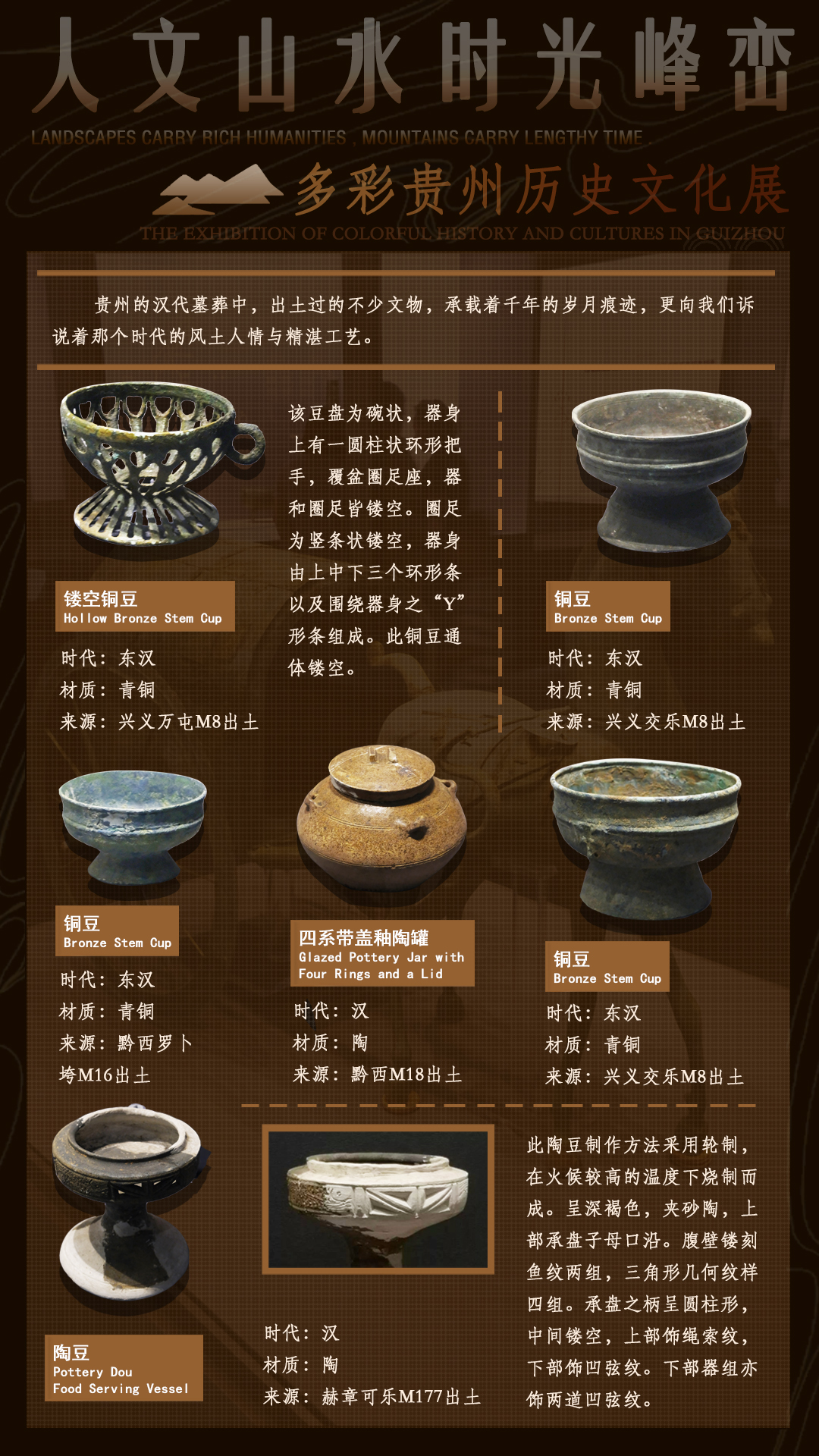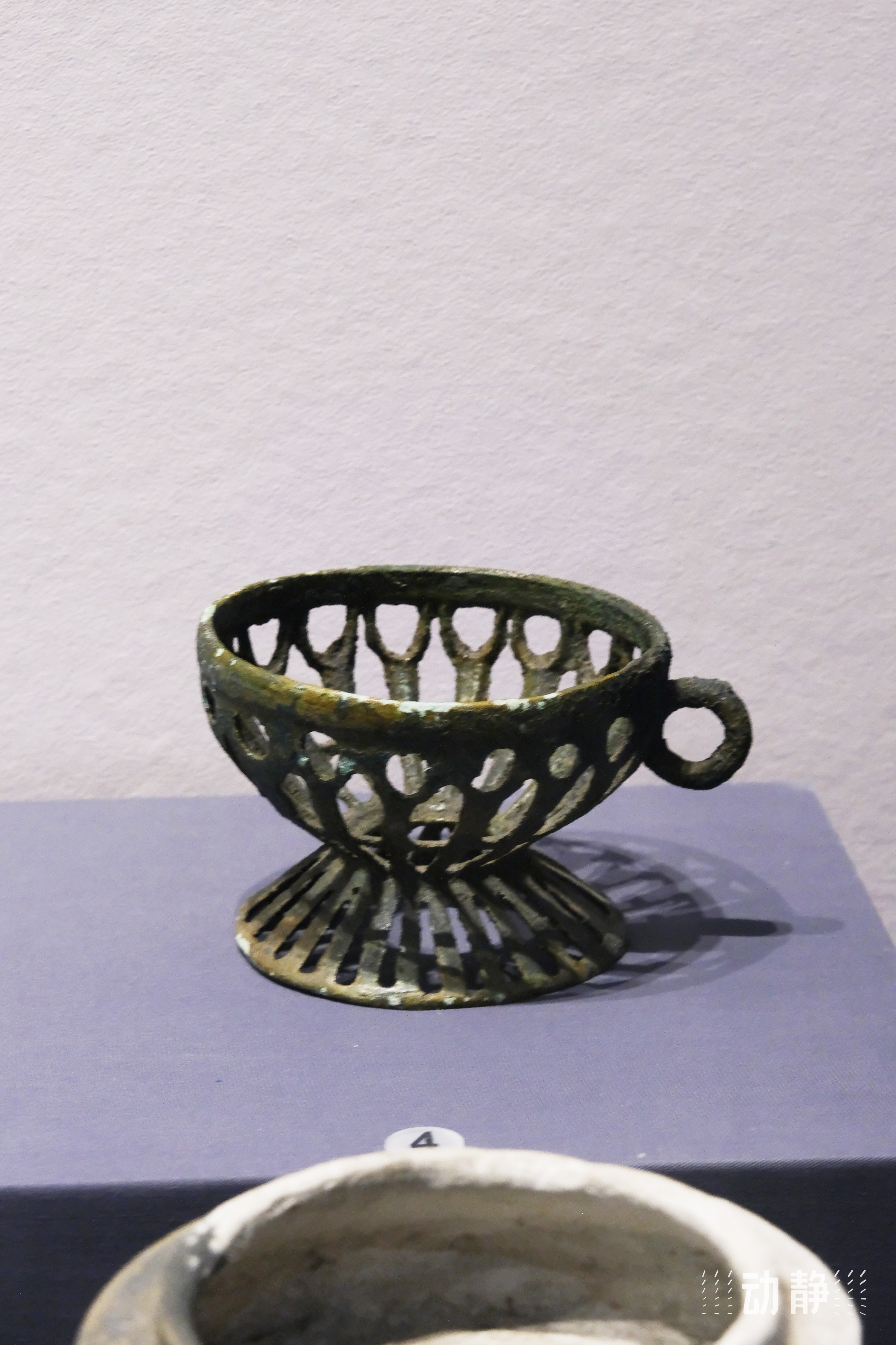 图中的镂空铜豆,为国家二级文物,也是贵州文物等级最高的一件铜豆。该豆盘为碗状,器身上有一圆柱状环形把手,覆盆圈足座,器和圈足皆镂空。圈足为竖条状镂空,器身由上中下三个环形条以及围绕器身之“Y”形条组成。与中原地区大多数镂空铜豆只是足部镂空成各种花纹不同,这件器物全身用不规则的圆孔和条形孔镂空,形似果篮,外观十分精致,非常罕见。