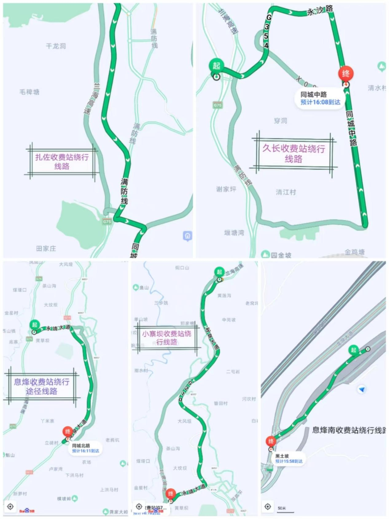 绕行路段建议:考虑到车流量逐步增加,高速支队一大队整理各个收费站相邻之间的绕行道路,请见图所示。