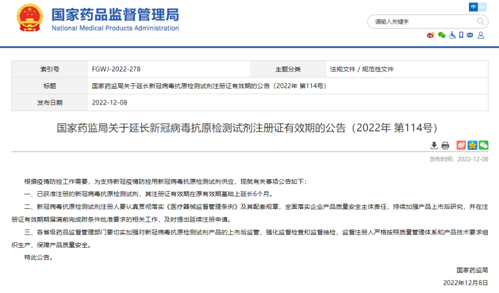 原标题:国家药监局关于延长新冠病毒抗原检测试剂注册证有效期的公告(2022年 第114号)