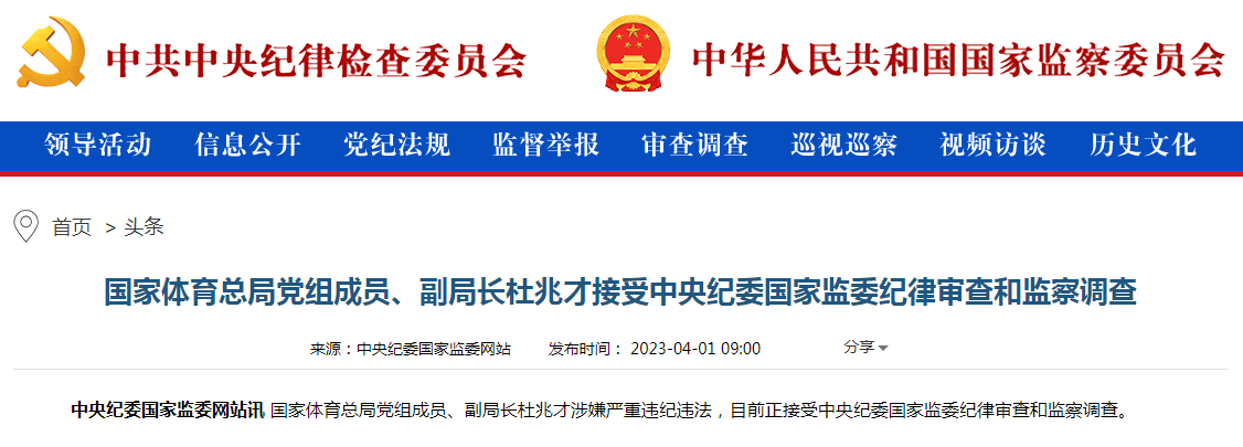 据中央纪委国家监委网站4月1日消息,国家体育总局党组成员、副局长杜兆才涉嫌严重违纪违法,目前正接受中央纪委国家监委纪律审查和监察调查。