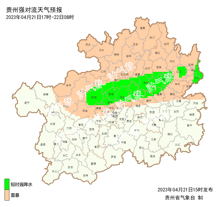 今天傍晚到夜间,西部边缘和西南部多云,其余地区阴天间多云有阵雨或雷雨,毕节市东部、贵阳市中北部、遵义市南部、铜仁市南部、黔南州北部、黔东南州北部局地中到大雨,部分乡镇暴雨,个别乡镇大暴雨,雷雨中伴有冰雹、雷暴大风、短时强降水等强对流;