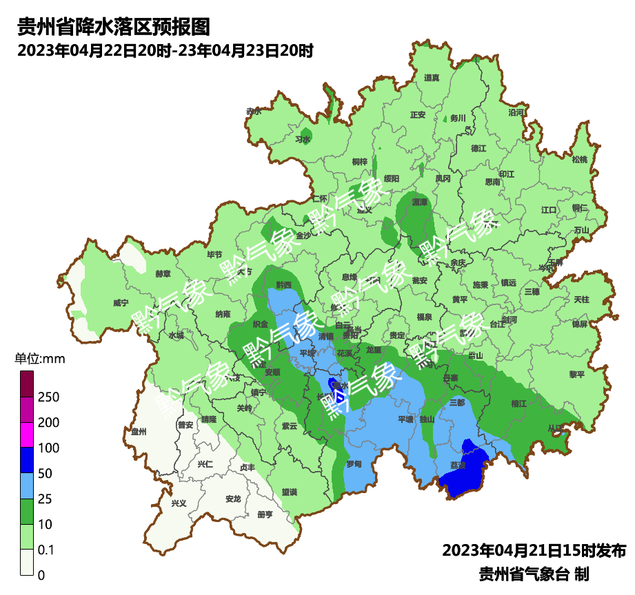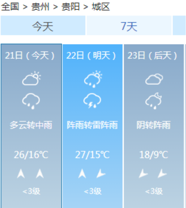22日,西南部多云,北部阴天有阵雨或雷雨,气温下降,其余地区多云转阴天有阵雨或雷雨,遵义市东部、毕节市东部、安顺市东部、贵阳市南部、黔南州中部、黔东南州西部局地中到大雨,部分乡镇暴雨,雷雨中伴有冰雹、雷暴大风、短时强降水等强对流;