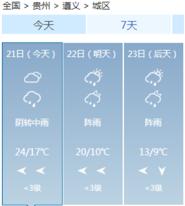 23日白天,阵雨转阴天,最高气温下降8-12℃;23日夜间到24日白天,阴天有阵雨。