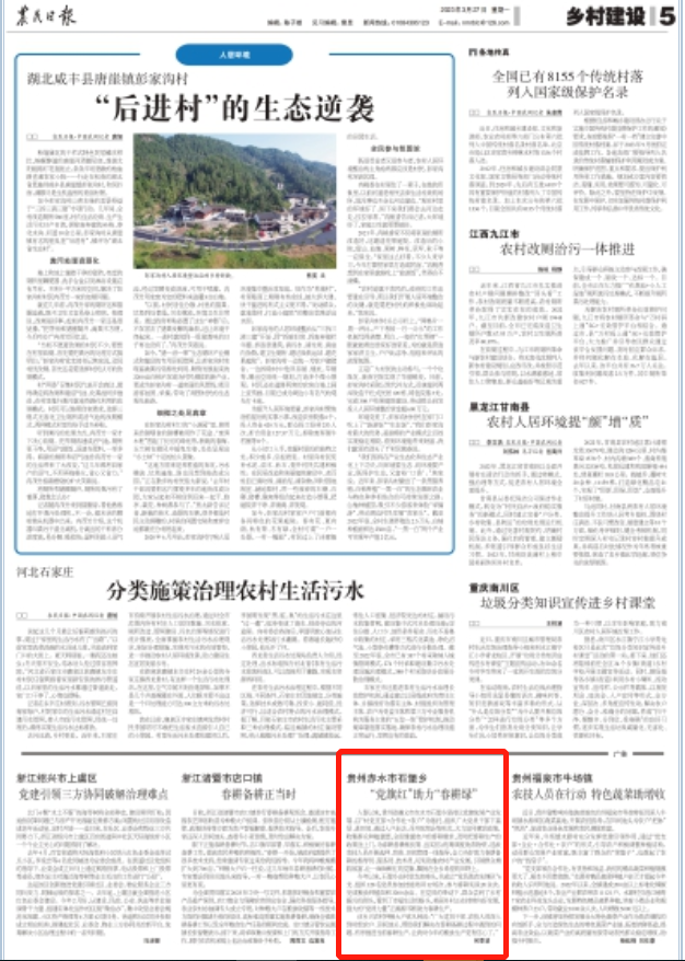 今天(3月27日),《农民日报》刊发新闻《贵州赤水市石堡乡“党旗红”助力“春耕绿”》。