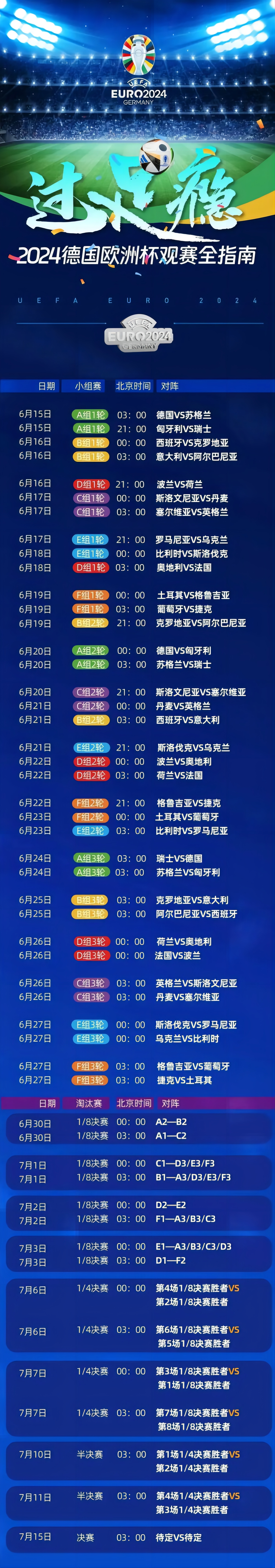 在这一个月的“欧洲杯时间”里,为让球迷们能够准时观看到所支持球队的比赛,我们特意备上一份“2024德国欧洲杯观赛全指南”,让各位球迷指南在手,看球不愁!