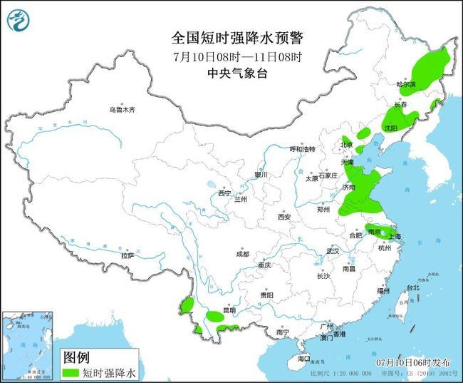 中央气象台7月10日06时继续发布强对流天气蓝色预警:预计7月10日08时至11日08时,吉林东南部、辽宁北部和西部、山东中东部和南部、江苏北部和南部、浙江北部等地的部分地区将有8-10级雷暴大风或冰雹天气;黑龙江中东部、吉林中东部、辽宁中北部和西南部、河北东北部、北京东北部、天津南部、山东、安徽北部、江苏北部和南部、上海、浙江北部、云南西部和南部等地的部分地区将有短时强降水天气,小时雨量30-50毫米,局地可达60毫米以上。