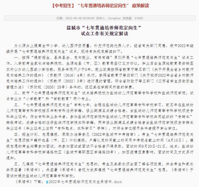 记者从盐城幼儿师范高等专科学校官网看到,盐城市从2021年起开始试点培养“七年贯通师范定向生”,试点培养院校为盐城幼儿师范高等专科学校和盐城师范学院,试点专业为“小学教育”和“学前教育”两个专业。
