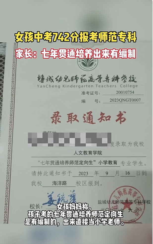 据媒体报道,近日,江苏盐城一位妈妈在社交平台晒出女儿中考成绩742分,拿到了盐城幼儿师范高等专科学校的录取通知书。有网友表示不理解,认为家长目光短浅;也有人认为人各有志,就业有兜底也挺好。
