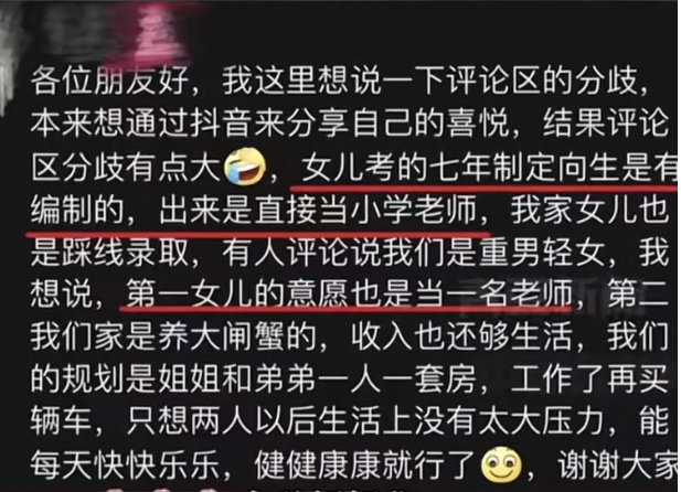 据女孩妈妈称,孩子考的“七年贯通培养师范定向生”是有编制的,出来直接当小学老师。家里不缺钱,只希望姐弟俩以后生活轻松快乐。