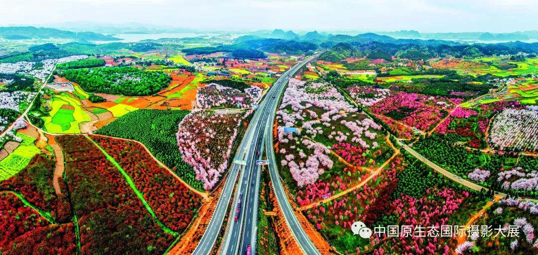 2015年贵州实现县县通高速,2021年高速公路通车里程突破8000公里。图为沪昆高速公路穿越贵州省贵安新区万亩樱花园。