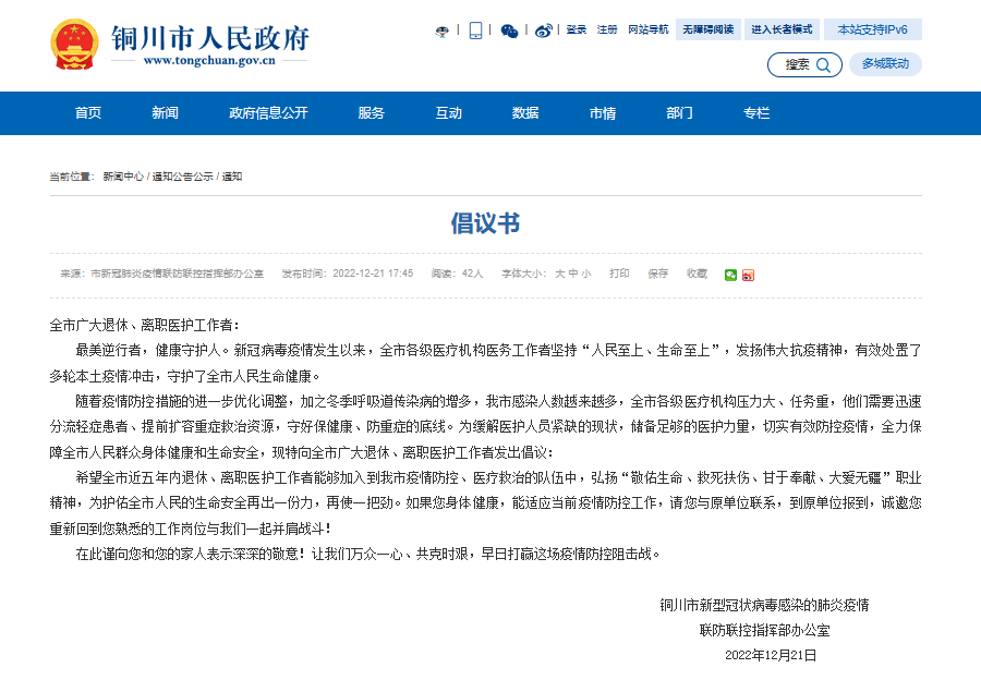 12月21日,陕西省铜川市政府网站发布《倡议书》。为缓解医护人员紧缺的现状,储备足够的医护力,倡议全市近五年内退休、离职医护工作者能够加入到铜川市疫情防控、医疗救治的队伍中。